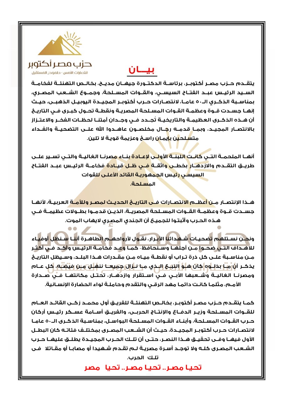 كما يتقدم حزب مصر أكتوبر، بخالص التهنئة للفريق أول محمد زكى القائد العام للقوات المسلحة وزير الدفاع والإنتاج الحربى، والفريق أسامة عسكر رئيس أركان حرب القوات المسلحة، وأبناء القوات المسلحة البواسل، بمناسبة الذكرى الـ50 عاما لانتصارات حرب أكتوبر المجيدة، حيث أن الشعب المصرى بمختلف فئاته كان البطل الأول فيها وفى تحقيق هذا النصر، حتى أن تلك الحرب المجيدة يطلق عليها حرب الشعب المصرى كله ولا توجد أسرة مصرية لم تقدم شهيدا أو مصابا أو مقاتلا فى تلك الحرب