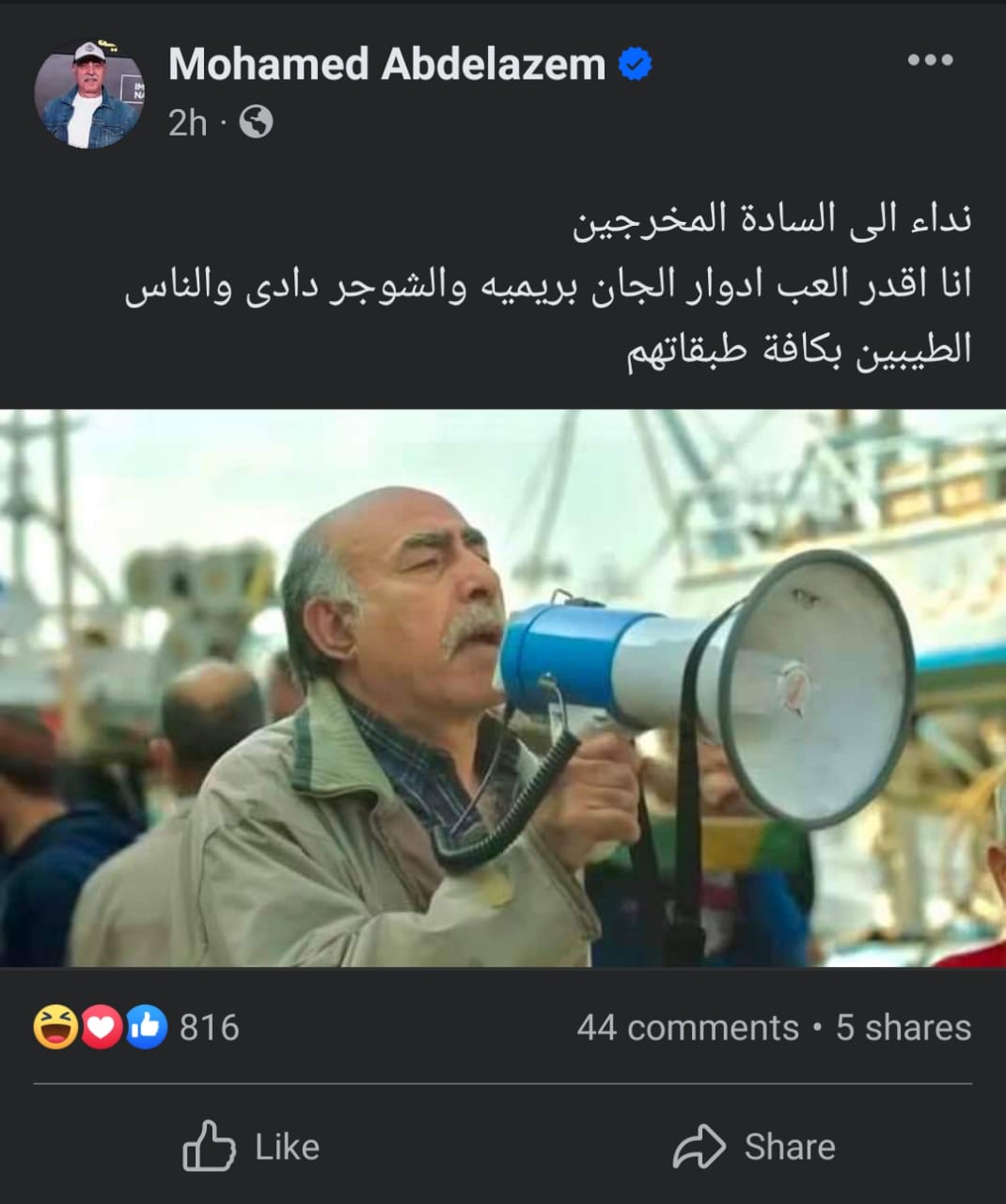 كتب الفنان محمد عبد العظيم منشور على صفحته الرسمية عبر موقع التواصل الاجتماعي “ فيسبوك ” و علق قائلا “ نداء الى السادة المخرجين .. أنا أقدر ألعب أدوار الجان بريميه و الشوجر دادي و الناس الطيبين بكافة طبقاتهم ” .