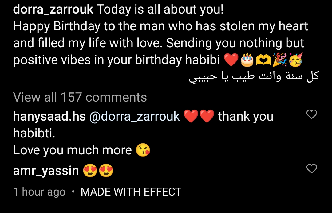 نشرت الفنانة درة صورة تجمعها مع زوجها على صفحتها الرسمية عبر موقع تبادل الصور و الفيديوهات “ انستجرام ” و علقت قائلة “ اليوم هو كل شيء عنك، عيد ميلاد سعيد للرجل الذي سرق قلبي وملأ حياتي بالحب، لن أرسل لك سوى المشاعر الإيجابية في عيد ميلادك ” .