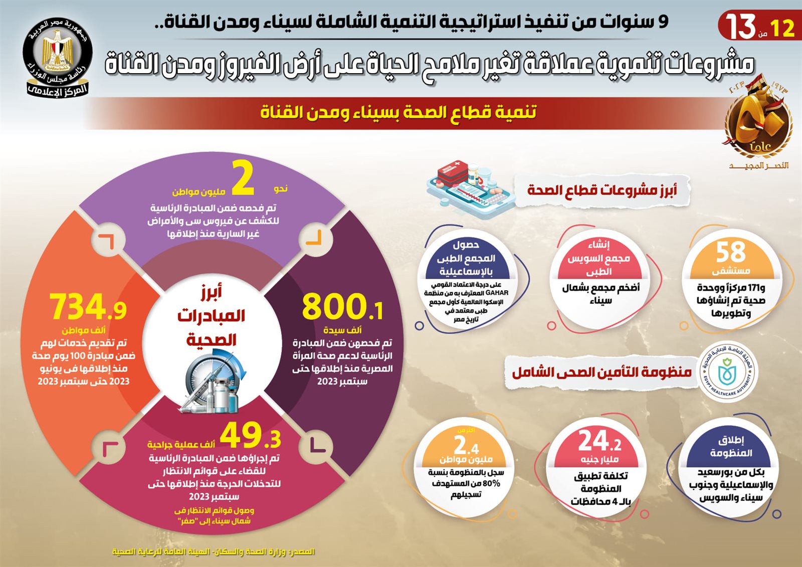 وفي هذا الصدد نشر المركز الإعلامي لمجلس الوزراء تقريراً تضمن إنفوجرافات تسلط الضوء على تغير ملامح الحياة على أرض الفيروز ومدن القناة بفضل المشروعات التنموية العملاقة خلال السنوات التسع الماضية التي شهدت تنفيذ استراتيجية التنمية الشاملة لسيناء ومدن القناة.