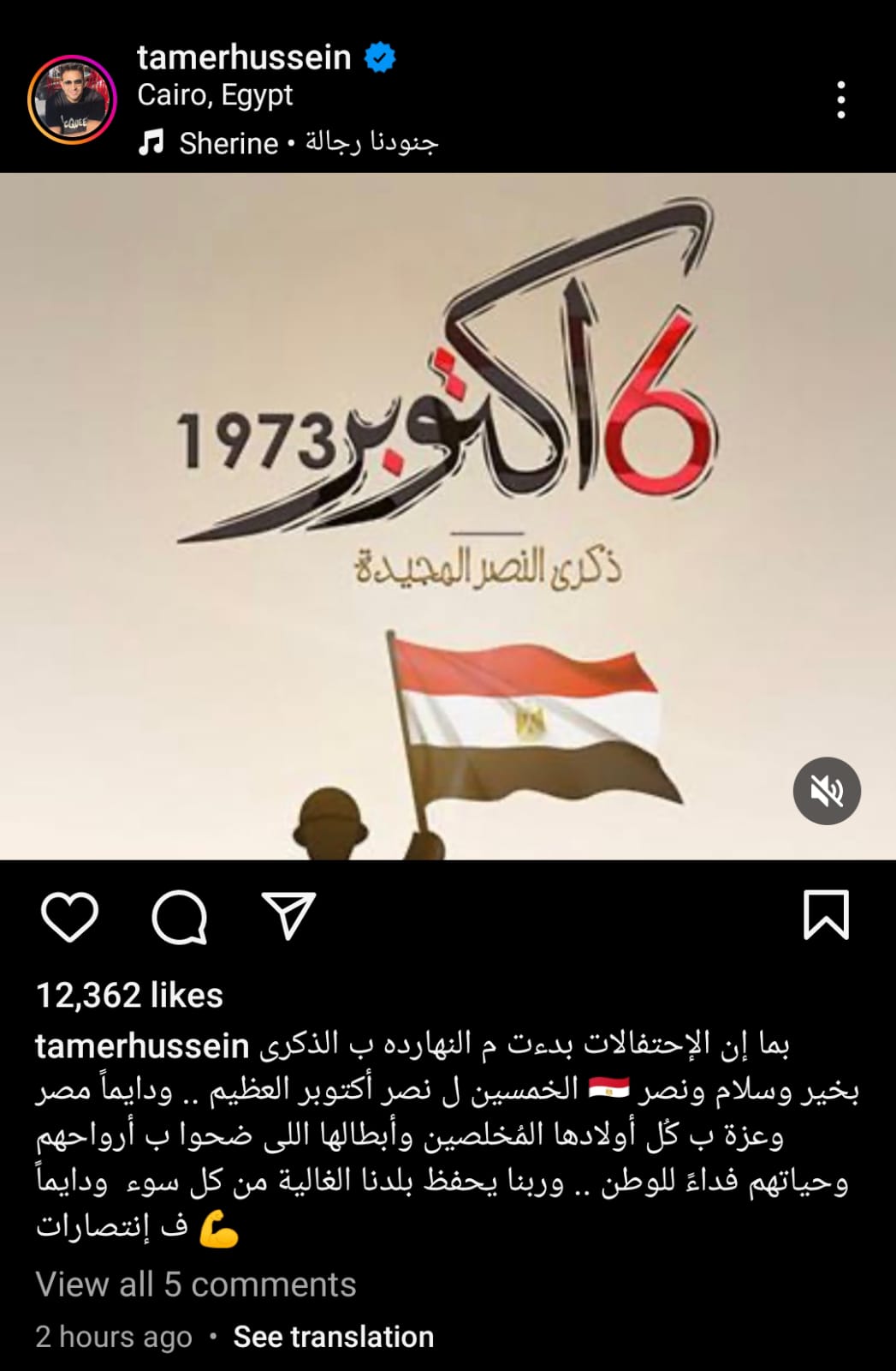 نشر تامر حسين صورة على صفحته الرسمية عبر موقع تبادل الصور و الفيديوهات “ انستجرام ” و علق قائلا “ بما أن الاحتفالات بدأت من النهاردة بالذكرى الخمسين لنصر أكتوبر العظيم، و دايما مصر بخير و سلام و نصر و عزة بكل أولادها المخلصين ” .