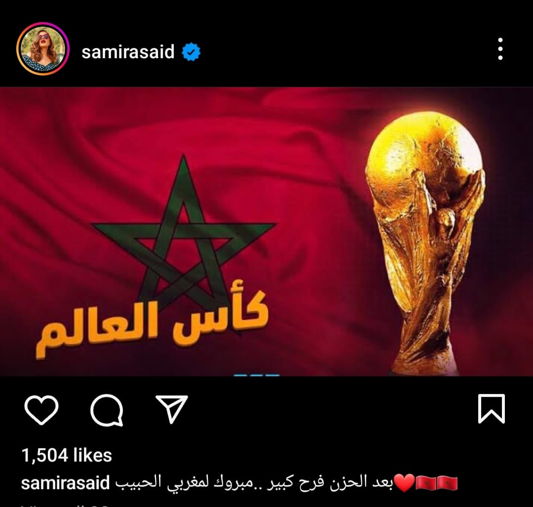 كاس العالم 2030 ..هنأت المطربة المغربية سميرة سعيد شعبها المغرب لحصوله على إستضافة تنظيم بطولة كأس العالم حيث شاركت بصورة لعلم بلادها،وذلك عبر حسابها الخاص بموقع تبادل الصور والفيديوهات"انستجرام" في كاس العالم 2030.