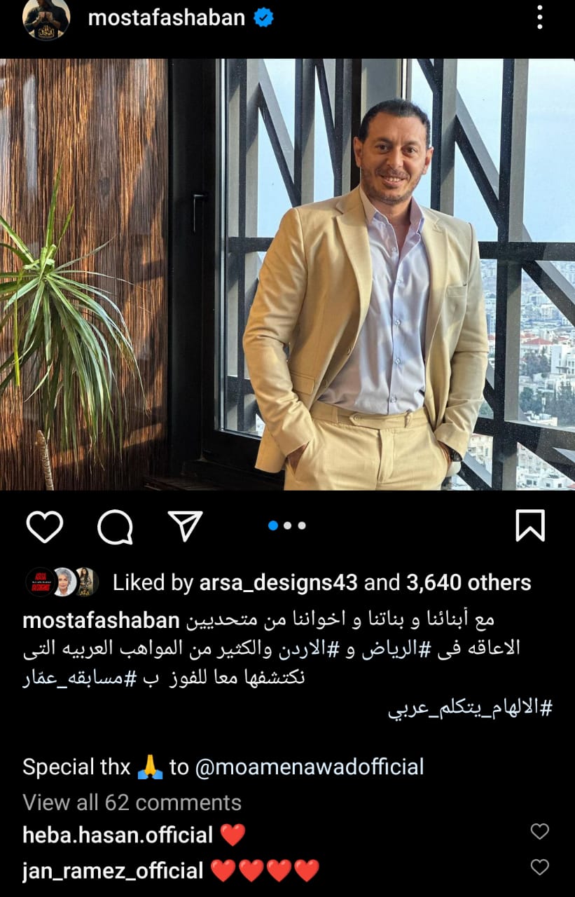 أعلن الفنان مصطفى شعبان عن حضوره مسابقة عمار كعضو لجنة تحكيم بمسابقة عمار لمتحديين الاعاقة، و ذلك من خلال صورة نشرها على صفحته الرسمية عبر موقع تبادل الصور و الفيديوهات “ انستجرام ” .