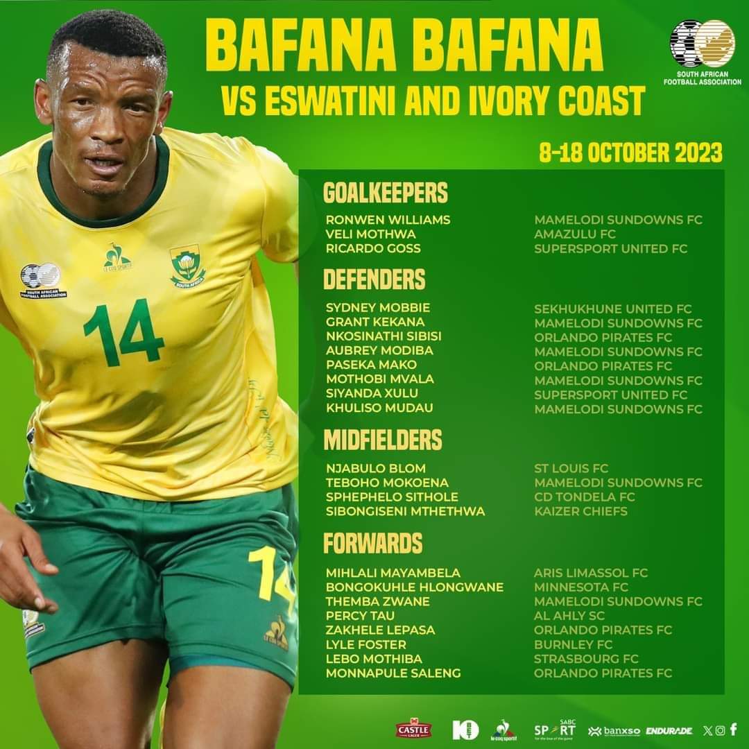 ويستضيف منتخب جنوب أفريقيا منتخب إيسواتيني في 13 أكتوبر 2023، قبل السفر للعب مع كوت ديفوار في 17 أكتوبر.