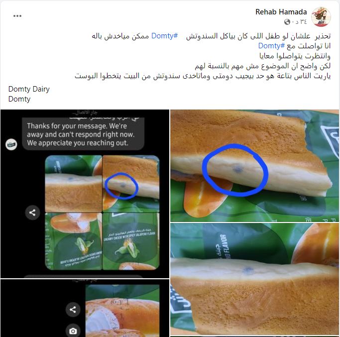 وقالت صاحبة الواقعة عبر السوشيال ميديا،" تحذير علشان لو طفل اللى كان بياكل السندوتش Domty ممكن مياخدش باله انا تواصلت مع Domty وانتظرت يتواصلوا معايا لكن واضح ان الموضوع مش مهم بالنسبة لهم".