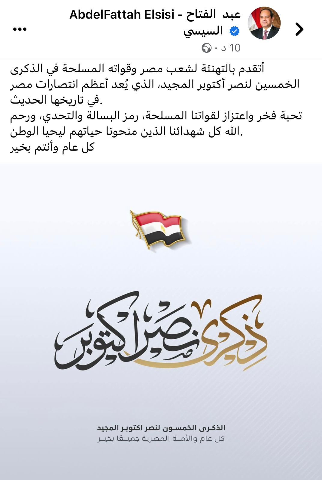 وكتب الرئيس السيسي عبر صفحته الرسمية على الفيسبوك:"أتقدم بالتهنئة لشعب مصر وقواته المسلحة في الذكرى الخمسين لنصر أكتوبر المجيد، الذي يُعد أعظم انتصارات مصر في تاريخها الحديث. تحية فخر واعتزاز لقواتنا المسلحة، رمز البسالة والتحدي، ورحم الله كل شهدائنا الذين منحونا حياتهم ليحيا الوطن. كل عام وأنتم بخير".