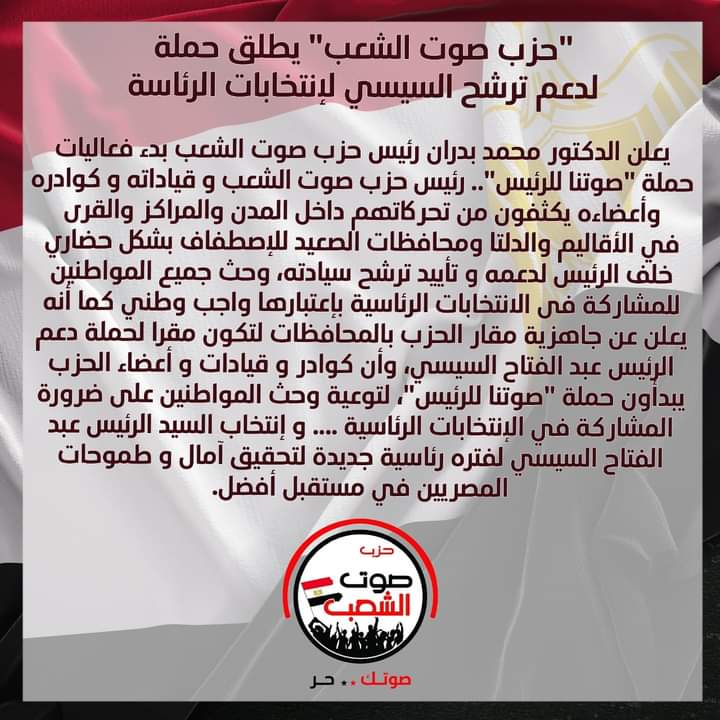 حزب صوت الشعب يطلق حملة لدعم ترشيح الرئيس السيسي لانتخابات الرئاسة