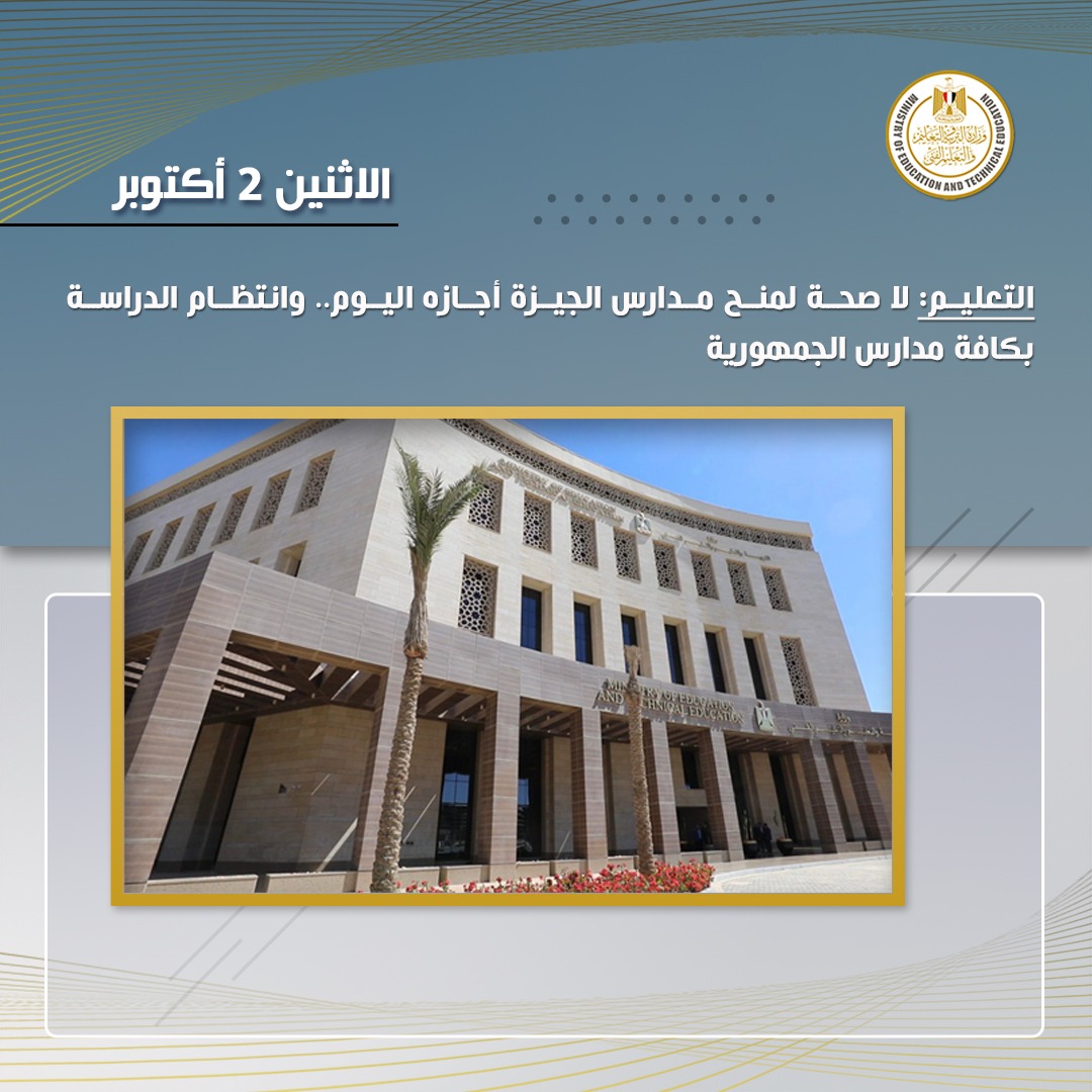 أكدت وزارة التربية والتعليم والتعليم الفنى أن ما أثير علي مواقع التواصل الاجتماعي حول منح مدارس محافظة الجيزة أجازه اليوم الاثنين ٢ أكتوبر، عار تماما عن الصحة وأن الدراسة منتظمة بصورة طبيعية بمدارس محافظة الجيزة وكافة مدارس الجمهورية.