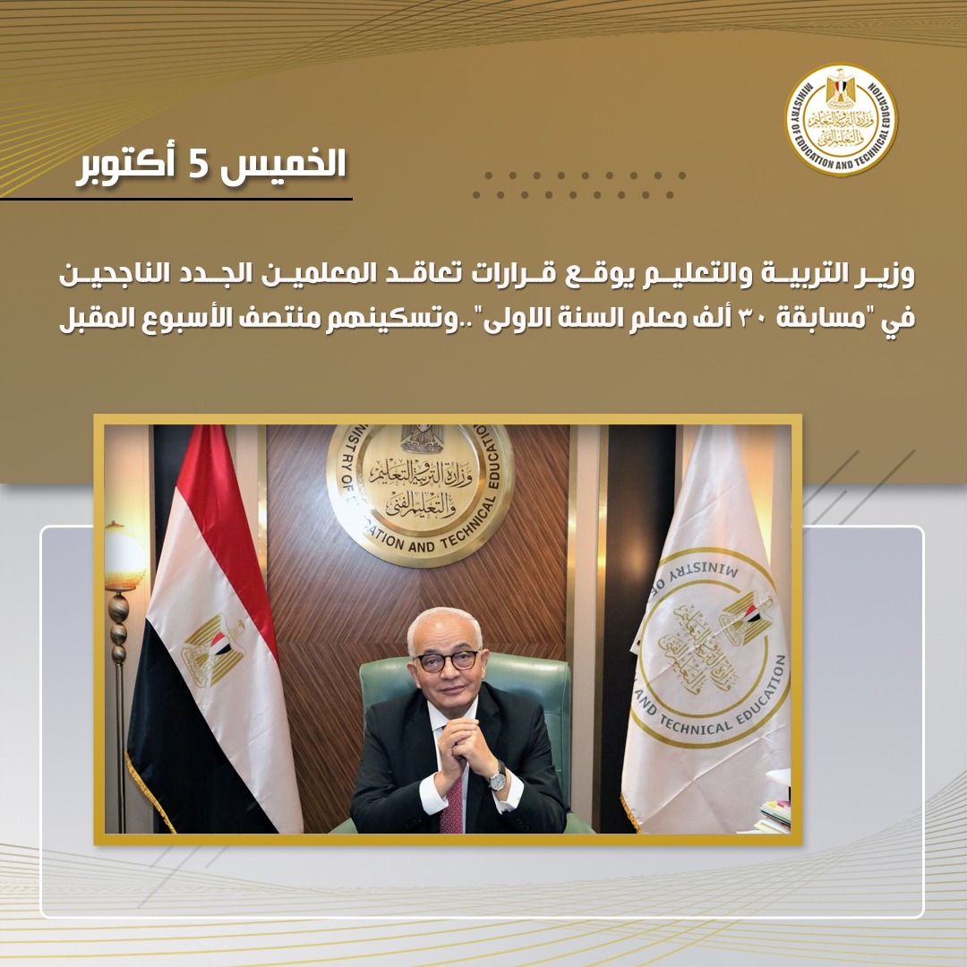 وقع الدكتور رضا حجازي وزير التربية والتعليم والتعليم الفني قرارات تعاقد المعلمين الجدد الفائزين في "مسابقة ٣٠ ألف معلم السنة الأولى"، وذلك استعدادا لبدء تسكينهم واستلامهم العمل منتصف الأسبوع المقبل وفقا للتوزيع الجغرافي بمختلف المديريات التعليمية على مستوى الجمهورية.