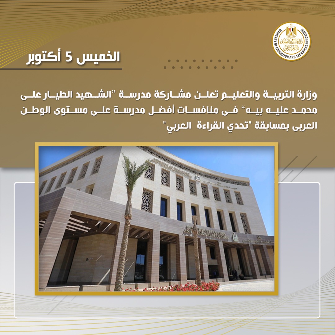 أعلنت وزارة التربية والتعليم والتعليم الفنى ترشيح مدرسة الشهيد الطيار على محمد على بيه للتعليم الابتدائى التابعة لإدارة مطاى التعليمية بمحافظة المنيا للمنافسة على جائزة أفضل مدرسة على مستوى الوطن العربي، وذلك في إطار فعاليات الحفل الختامي لمسابقة "تحدي القراءة العربي" بالتعاون مع دولة الإمارات العربية المتحدة، والذى سيقام في دبي يوم ٣١ أكتوبر.