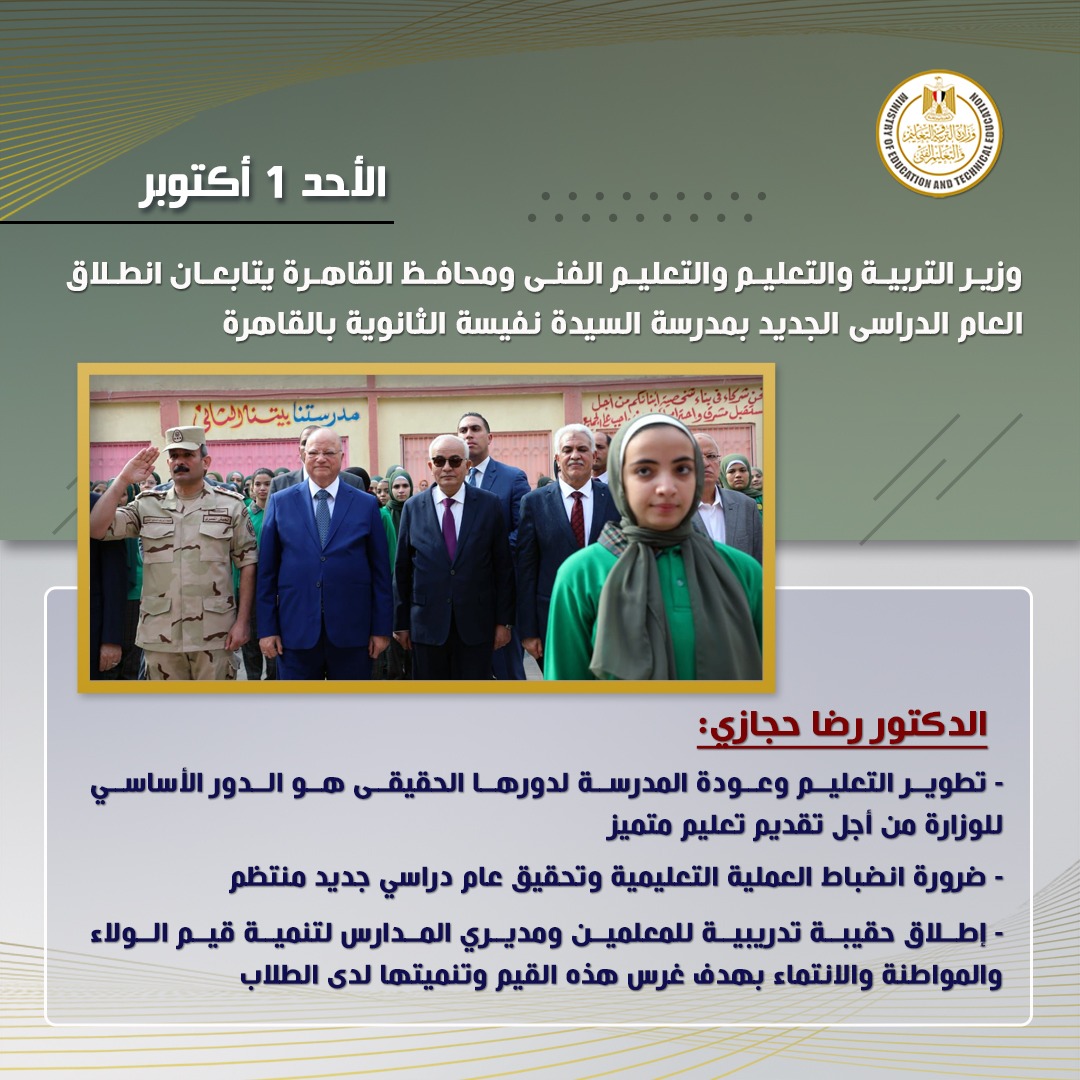 قام الدكتور رضا حجازى وزير التربية والتعليم والتعليم الفنى، واللواء خالد عبد العال، ، بمتابعة انطلاق العام الدراسى الجديد ٢٠٢٣ / ٢٠٢٤، بمدرسة السيدة نفيسة الثانوية للبنات التابعة لإدارة شرق مدينة نصر التعليمية، حيث يبلغ عدد الطالبات بها ٦٠٣ طالبة، وعدد الفصول ١٦ فصل.