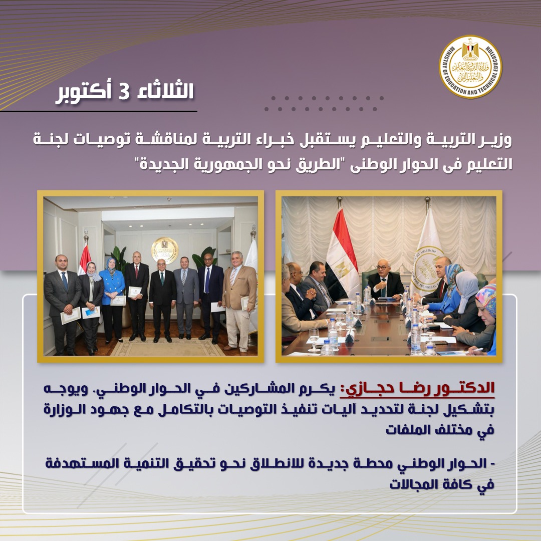 بناء على توجيهات فخامة السيد الرئيس عبد الفتاح السيسي رئيس الجمهورية لبحث ودراسة وتنفيذ مخرجات الحوار الوطنى، استقبل الدكتور رضا حجازى وزير التربية والتعليم والتعليم الفنى خبراء التربية الذين شاركوا فى فعاليات الحوار الوطنى "الطريق نحو الجمهورية الجديدة".