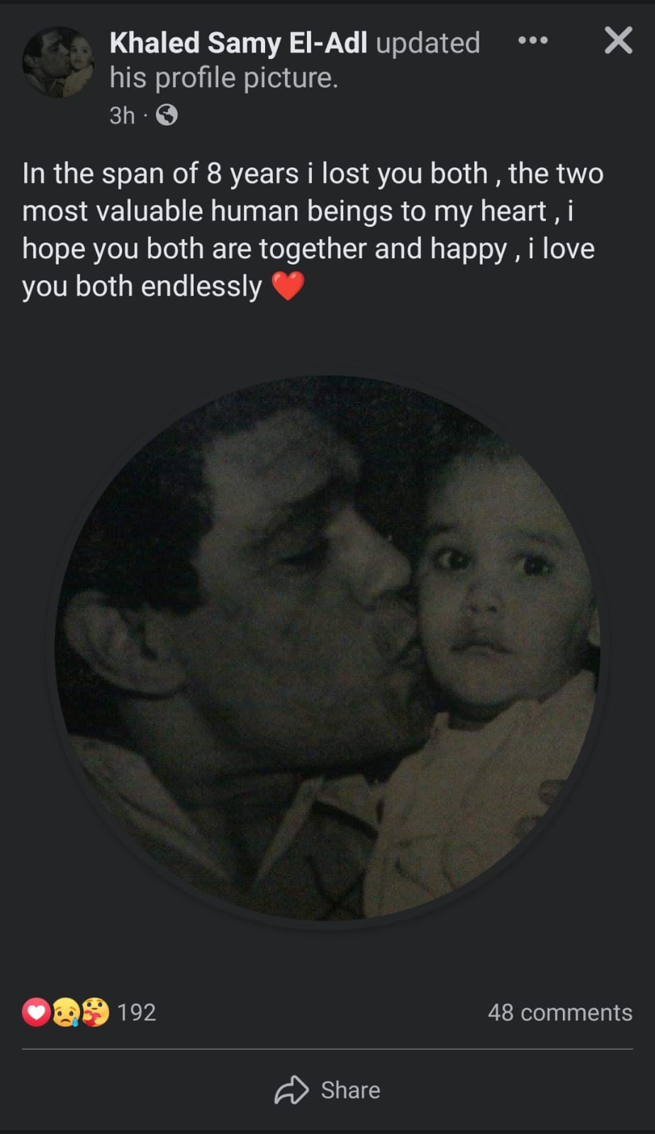 ونشر خالد سامي العدل صورة تجمع والده مع شقيقه و هو طفلا على صفحته الرسمية عبر موقع التواصل الاجتماعي “ فيسبوك ” و علق قائلا “ في غضون 8 سنوات فقدتكما، أغلى انسانين في قلبي، أتمنى أن تكونا معا و سعيدين، أحبكما الى ما لا نهاية ” .