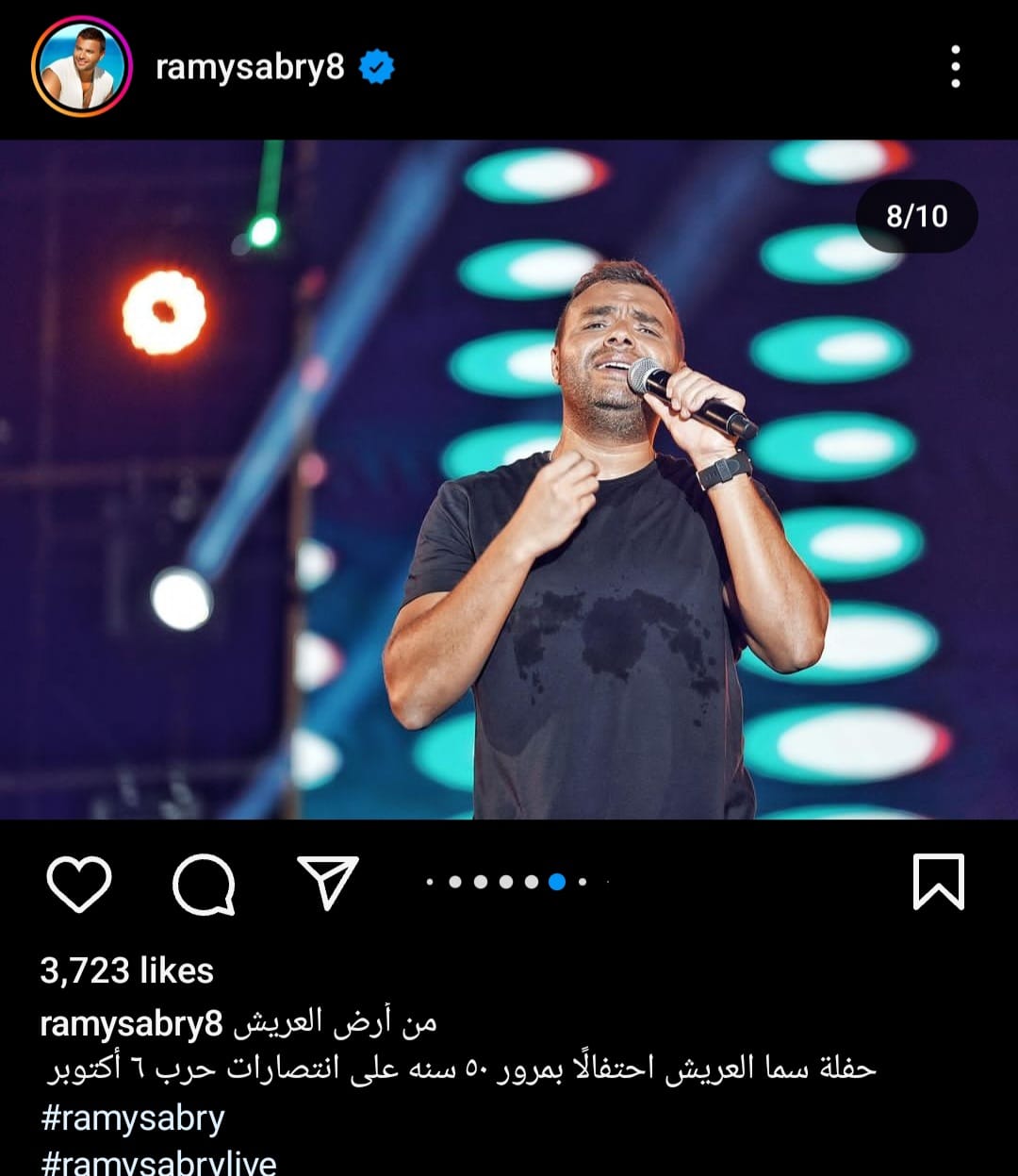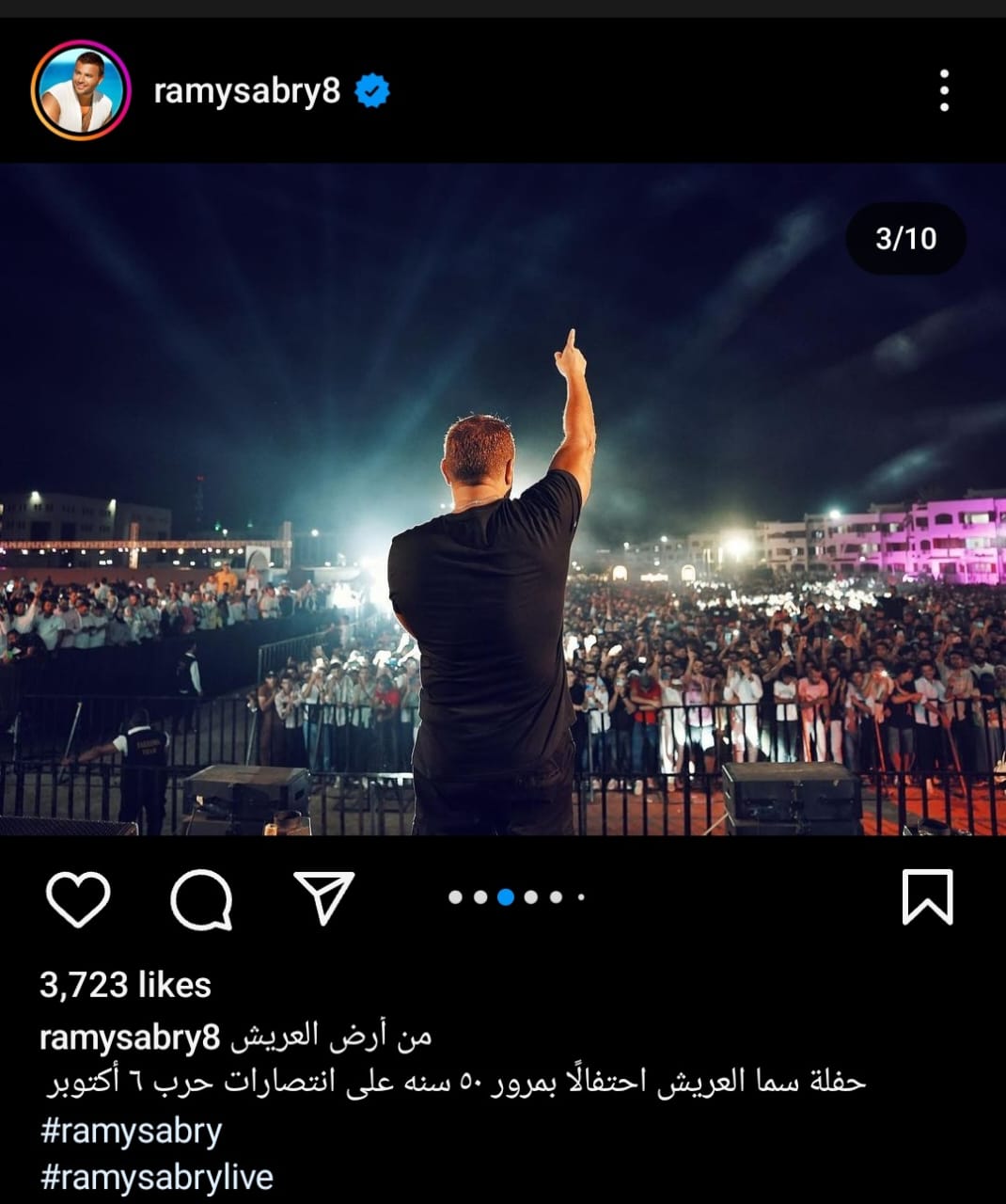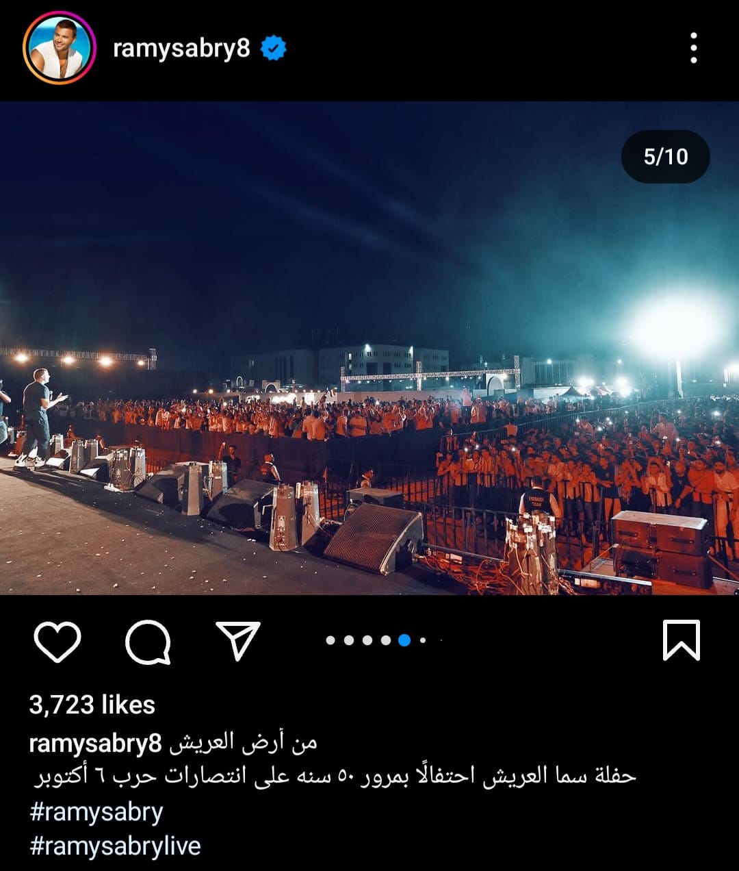 شارك رامي صبري، جمهوره بصورة له من داخل حفلته بالعريش عبر حسابه الخاص بموقع تبادل الصور والفيديوهات"انستجرام" علق صبري قائلا:"من أرض العريش حفلة سما العريش إحتفالا بمرور 50سنة على إنتصارات حرب 6 أكتوبر".