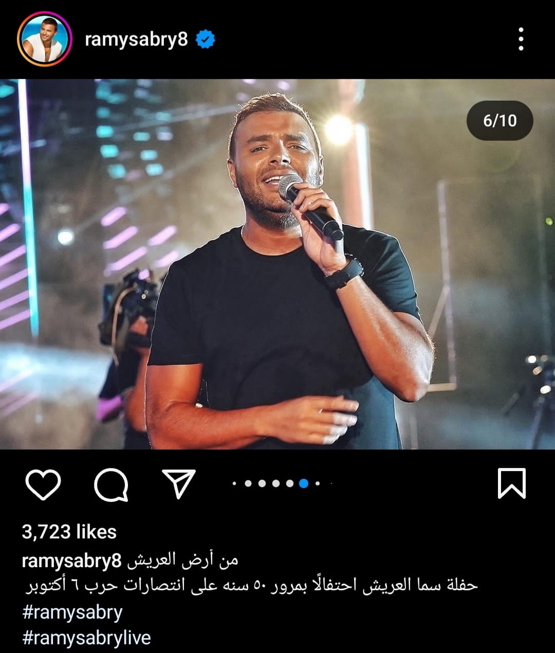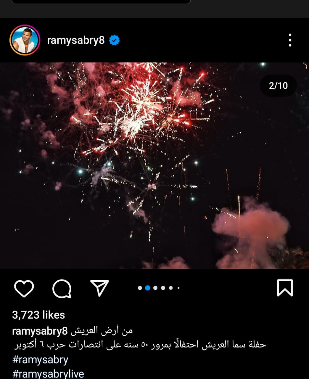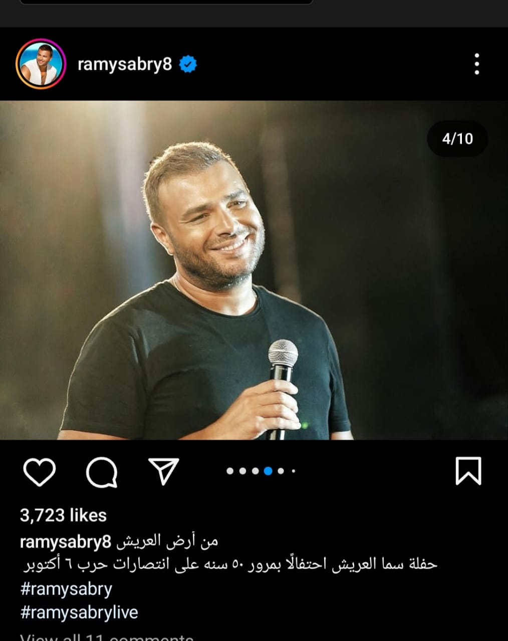 شارك رامي صبري، جمهوره بصورة له من داخل حفلته بالعريش عبر حسابه الخاص بموقع تبادل الصور والفيديوهات"انستجرام" علق صبري قائلا:"من أرض العريش حفلة سما العريش إحتفالا بمرور 50سنة على إنتصارات حرب 6 أكتوبر".