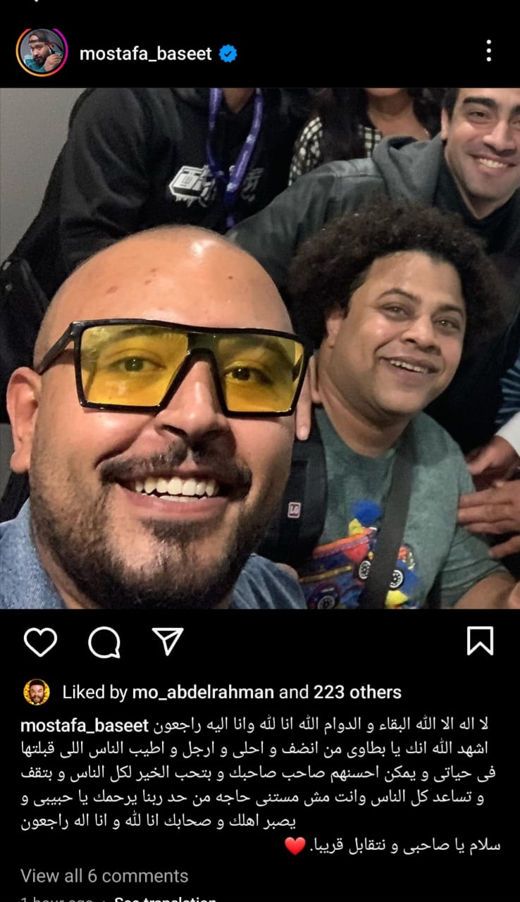 علق بسيط قائلا"لا إله إلا الله البقاء والدوام لله إنا لله وإناى إليه راجعون أشهد الله إنك يا بطاوي من أنضف وأحلى وأرجل وأطيب الناس اللي قبلتها في حياتي ويمكن أحسنهم صاحب صاحبك وبتحب الخير لكل الناس وبتقف وتساعد كل الناس وأنت مش مستني حاجه من حد ربنا يرحمك يا حبيبي ويصبر أهلك وصحابك إنا لله وإنا إليه راجعون سلام يا صاحبي ونتقابل قريب إن شاء الله".