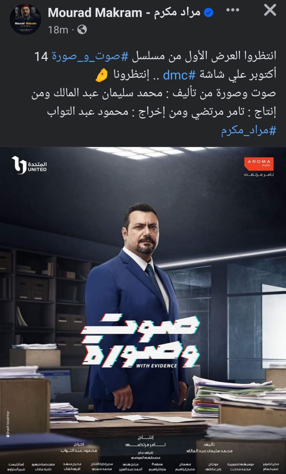 روج الفنان مراد مكرم لمسلسل “ صوت و صورة ” الذي من المقرر أن يعرض يوم 14 أكتوبر المقبل، و ذلك من خلال صورة نشرها على صفحته الرسمية عبر موقع التواصل الاجتماعي “ فيسبوك ” .