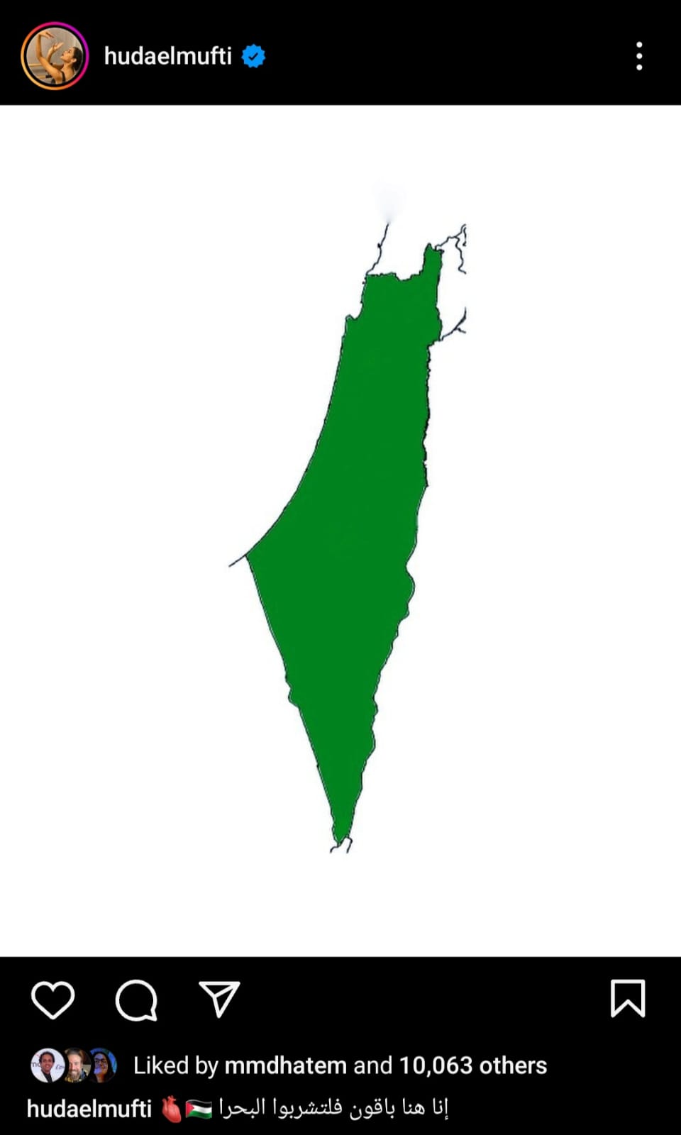 ونشرت المفتي صورة لخريطة فلسطين، وذلك عبر حسابها الخاص بموقع تبادل الصور والفيديوهات"انستجرام"، وعلقت عليها قائلة: "إنا هنا باقون فلتشربوا البحرا".