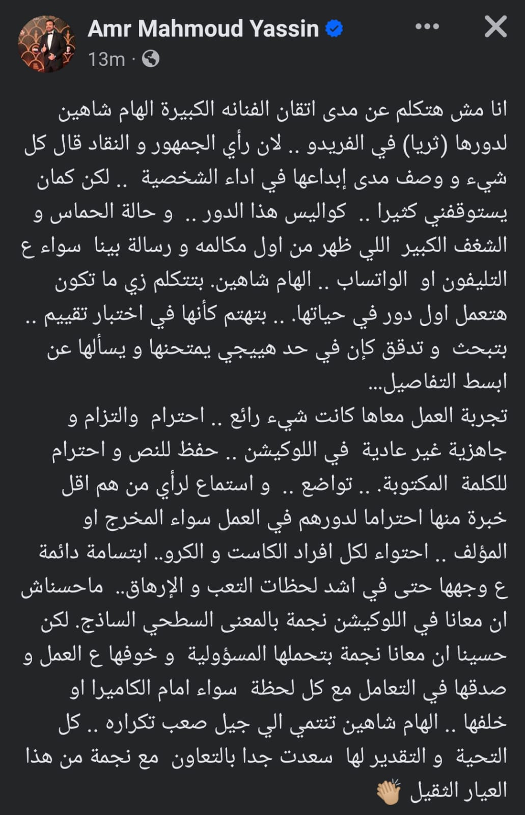 و اختتم “ الهام شاهين تنتمي الى جيل صعب تكراره، كل التحية و القدير لها، سعدت جدا بالتعاون مع نجمة من هذا العيار الثقيل ” .