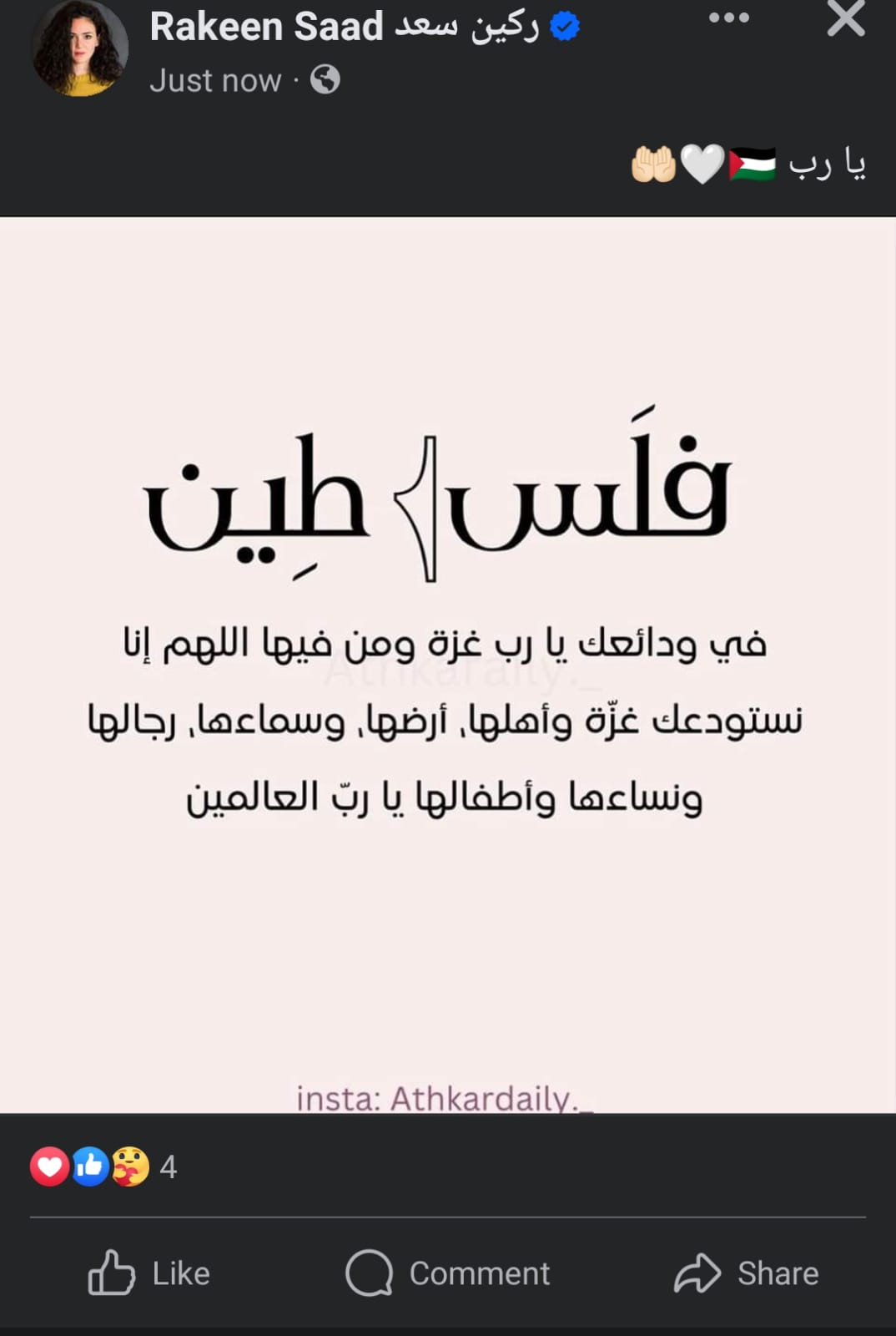 نشرت ركين سعد صورة على صفحتها الرسمية عبر موقع التواصل الاجتماعي “ فيسبوك ” و علقت قائلة " فلسطين في ودائعك يارب غزة و من فيها، اللهم إنا نستودعك غزة و أهلها و أرضها و سماءها و رجالها و نساءها و أطفالها يارب العالمين .