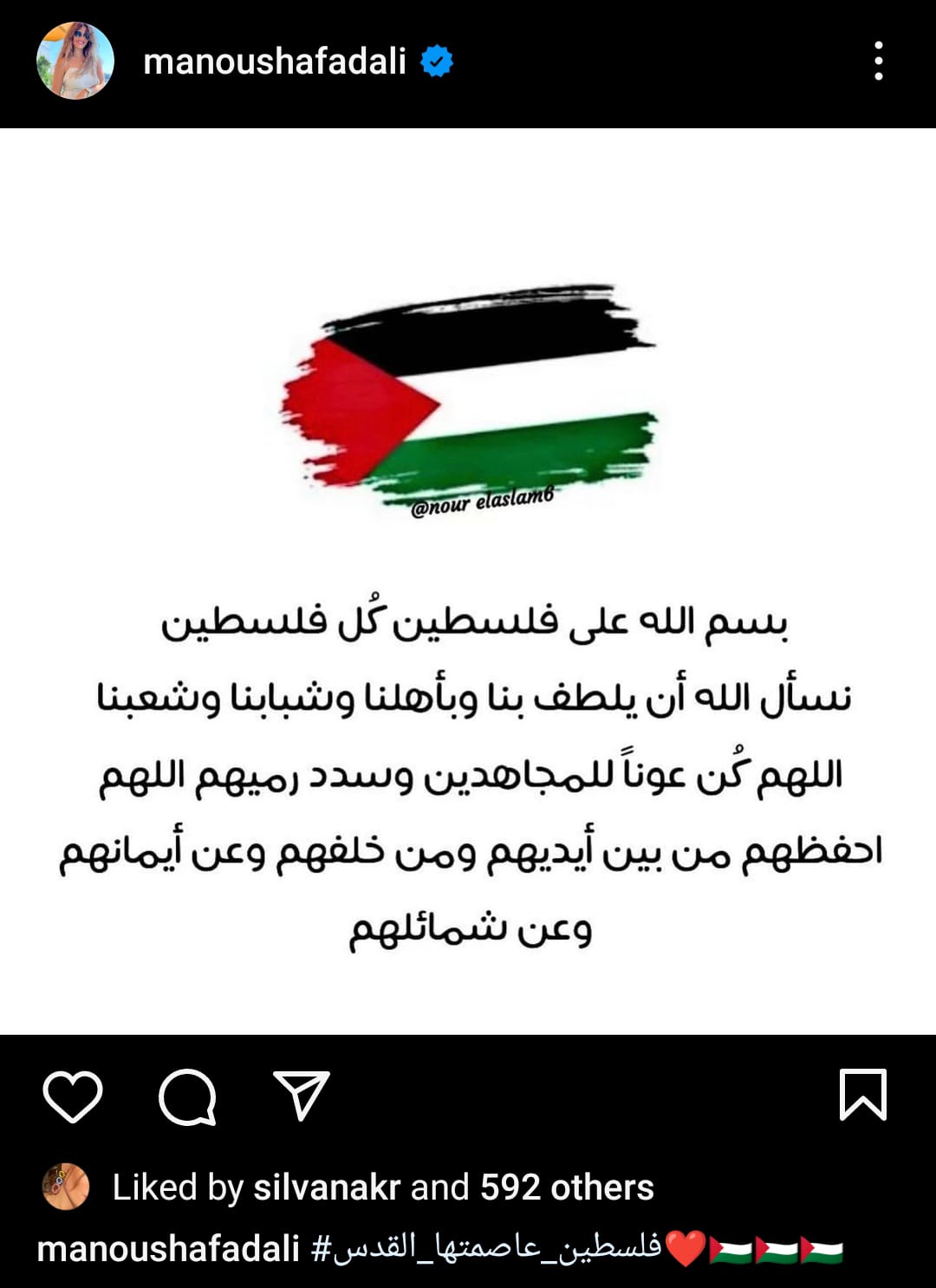 نشرت منة فضالي صورة على صفحتها الرسمية عبر موقع تبادل الصور و الفيديوهات “ انستجرام ” و علقت قائلة “ فلسطين عاصمتها القدس .. بسم الله على فلسطين، كل فلسطين ..نسأل الله أن يلطف بنا و بأهلنا و شبابنا و شعبنا ” .
