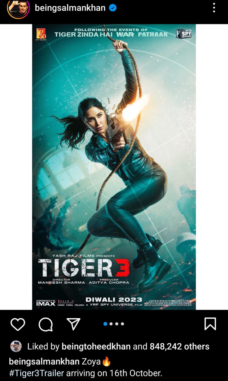 نشر سلمان خان صورة البوستر الرسمي الخاص بكاترينا كييف على صفحته الرسمية عبر موقع تبادل الصور و الفيديوهات “ انستجرام ” و علق قائلا “ زويا .. الاعلان الرسمي لـ Tiger 3 قادم يوم 16 أكتوبر ” .