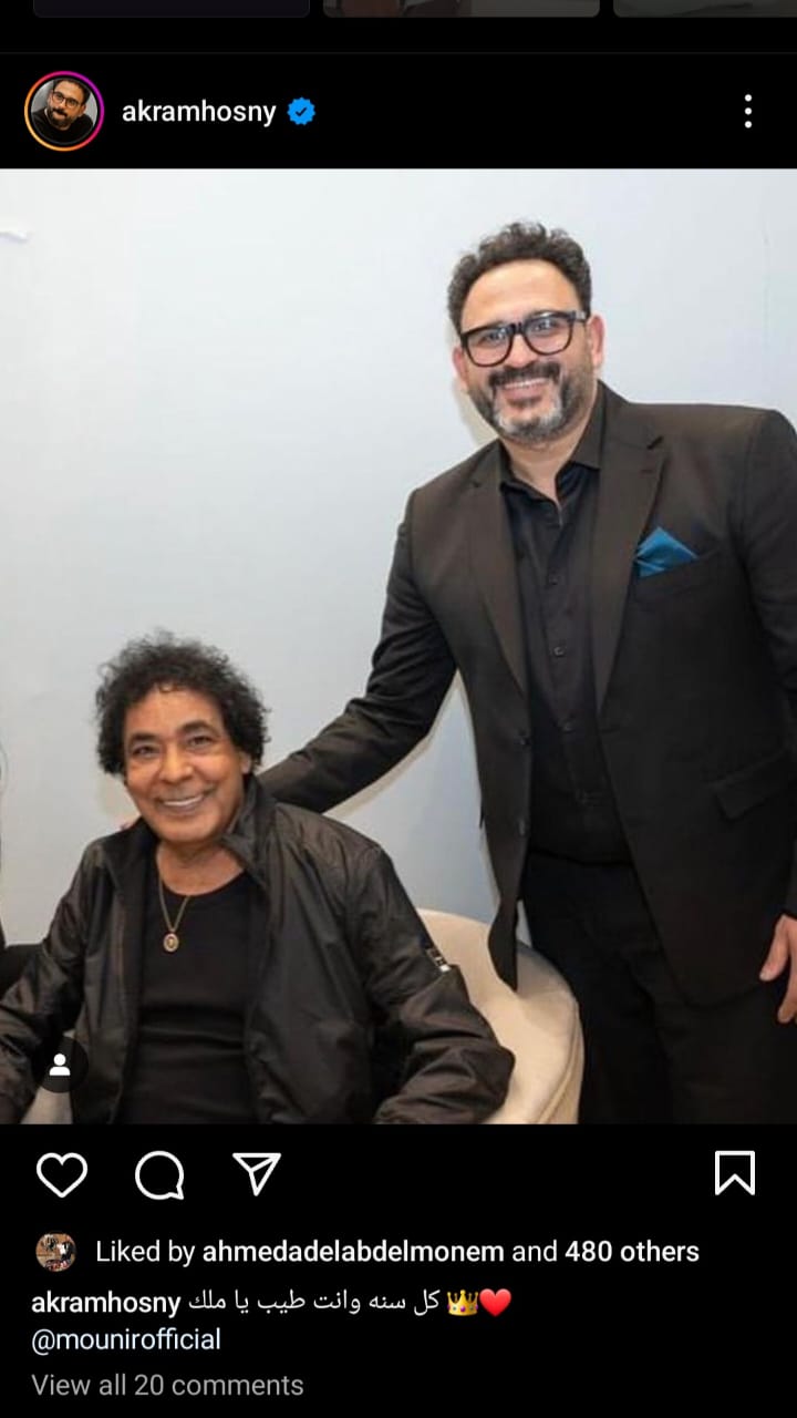 هنأ الفنان أكرم حسني الفنان محمد منير بمناسبة عيد ميلاده حيث شارك جمهوره بصورة لهما معا،وذلك عبر حسابه الخاص بموقع تبادل الصور والفيديوهات"انستجرام".