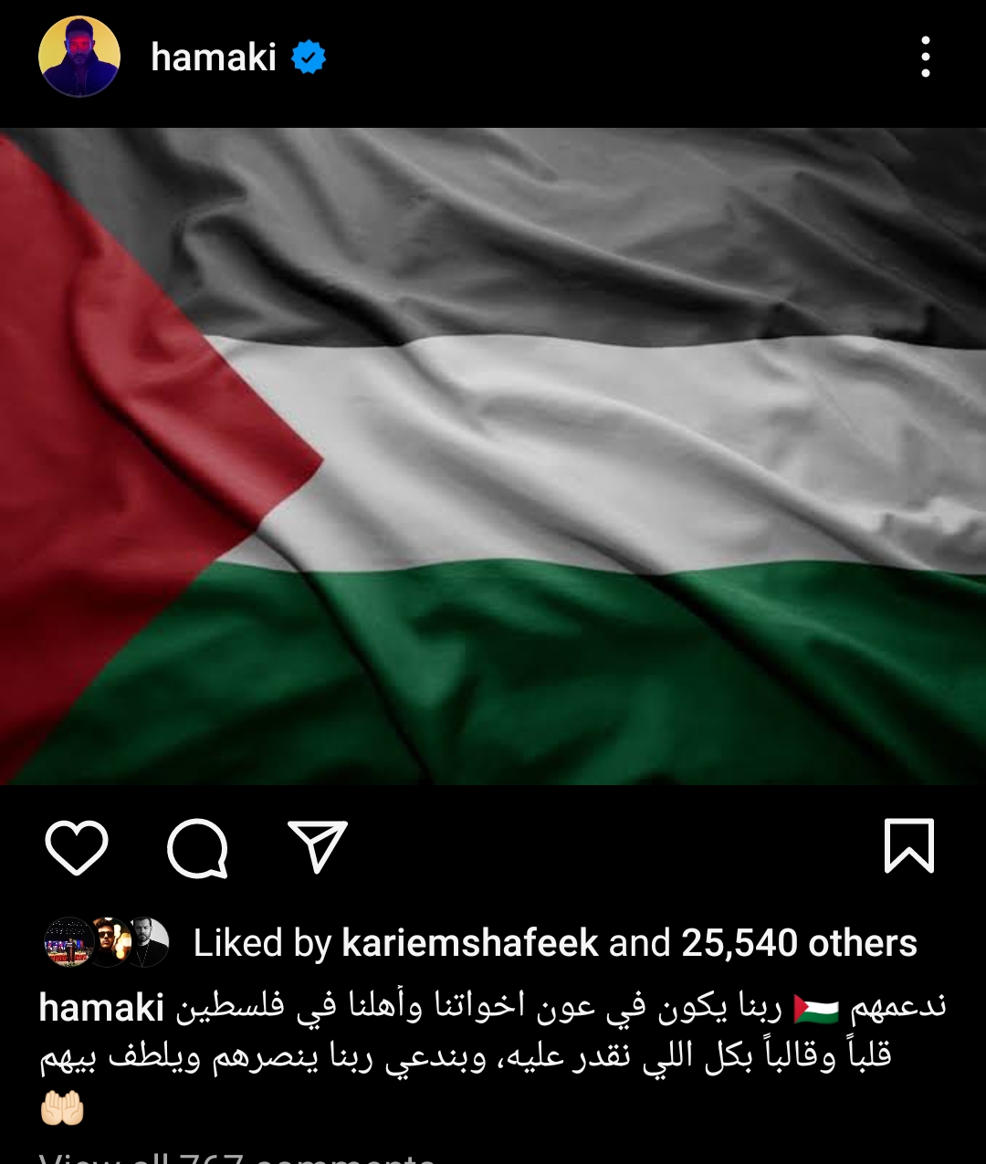 نشر الفنان محمد حماقي صورة على صفحته الرسمية عبر موقع تبادل الصور و الفيديوهات “ انستجرام ” و علق قائلا “ ندعمهم .. ربنا يكون في عون اخواتنا و أهلنا في فلسطين قلبا و قالبا، بكل اللي نقدر عليه، و بندعي ربنا ينصرهم و يلطف بيهم ” .