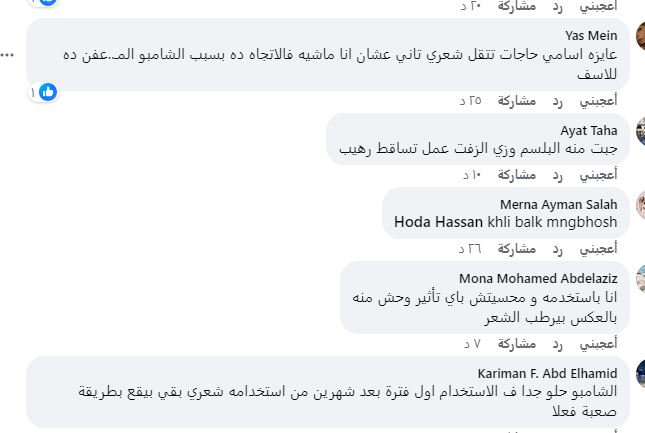 وتفاعل معها عدد من السيدات " عايزه اسامي حاجات تتقل شعري تاني عشان انا ماشيه فالاتجاه ده بسبب الشامبو المـعفن ده للاسف"، وعلقت سيدة أخرى وقالت " الشامبو حلو جدا ف الاستخدام اول فترة بعد شهرين من استخدامه شعري بقي بيقع بطريقة صعبة فعلا