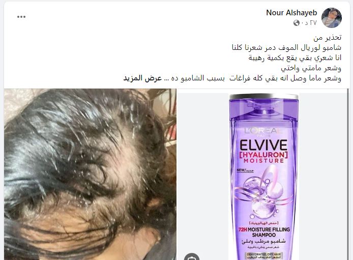 وقالت الفتاة مستعرضه مشكلتها عبر السوشيال ميديا ،" تحذير من شامبو لوريال الموف دمر شعرنا كلنا انا شعري بقي يقع بكمية رهيبة وشعر مامتي واختي وشعر ماما وصل انه بقي كله فراغات بسبب الشامبو ده ودي صورتها محدش يستخدمه".