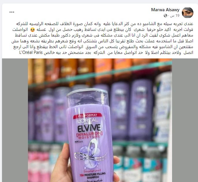 واستعرضت سيدة أخرى مشكلتها مع نفس المنتج قائلة ،" عندى تجربه سيئه مع الشامبو ده من كتر الدعايا عليه وانه كمان صورة الغلاف للصفحه الرئيسيه للشركه قولت اجربه اكيد حلو حرفيا شعرى كان بيطلع فى ايدى تساقط رهيب حصل من اول غسله اتواصلت معاهم اعمل شكوى لقيت الرد ان انا الى عندى مشكله فى شعرى ولازم دكتور طبعا مكنش عندى تساقط اصلا قبل ما استخدمه عملت بحث طلع تقريبا كل الناس بتشتكى انه وقع شعرهم بطريقه بشعه وهما مش مقتنعين ان الشامبو فيه مشكله والمفروض يتسحب من السوق اتواصلت تانى الخط بيقطع وانا الى ارجع اتصل ولاحد بيتكلم اصلا ولا حد اتواصل معايا من الشركه بجد منصحش حد بيه خالص"