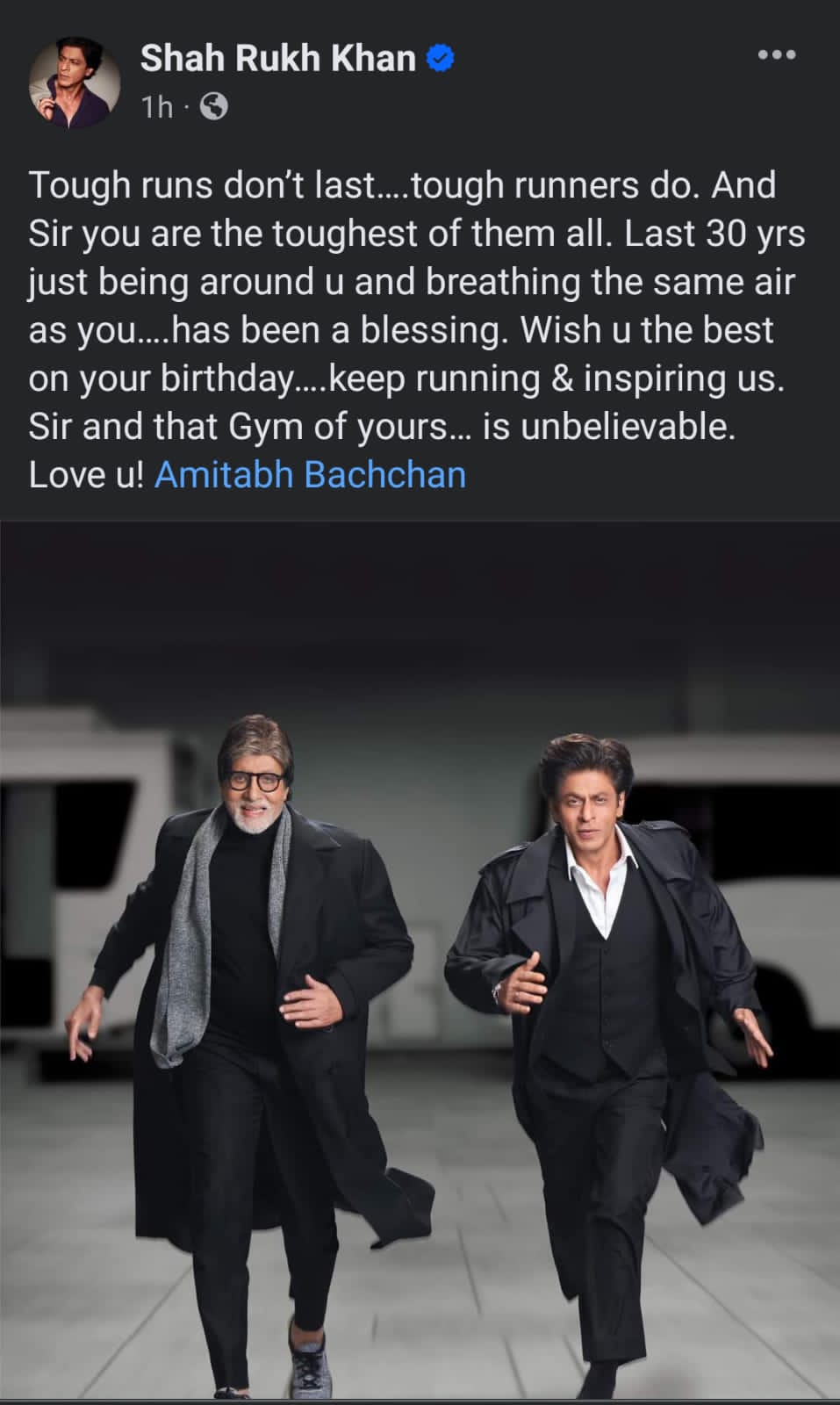 ونشر شاروخان صورة تجمعه مع أميتاب باتشان على صفحته الرسمية عبر موقع التواصل الاجتماعي " فيسبوك " و علق قائلا " السباقات الصعبة لا تدوم المتسابقون الأقوياء يدومون. وسيدي أنت الأصعب منهم جميعاً في آخر 30 عامًا، كان مجرد التواجد حولك واستنشاق نفس الهواء الذي تتنفسه بمثابة نعمة. أتمنى لك الأفضل في عيد ميلادك استمر في الجري وإلهامنا سيدي وصالة الألعاب الرياضية الخاصة بك أمر لا يصدق. أحبك! "