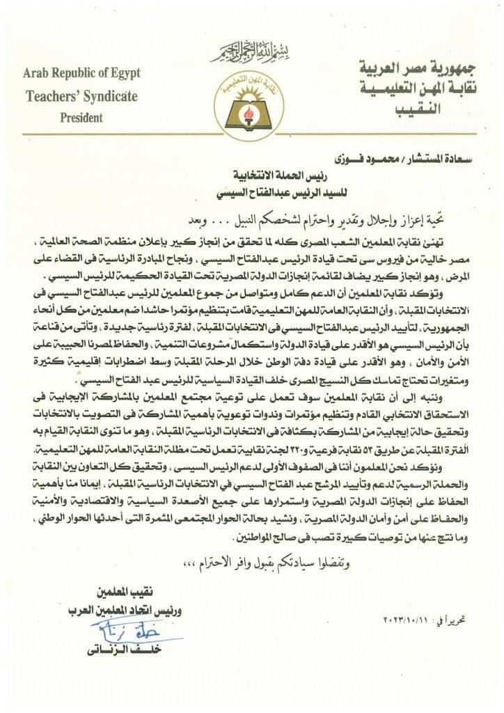 الحملة الانتخابية للسيسي تتلقى خطاباً من نقابة المعلمين تعلن فيه تأييدها للمرشح الرئاسي