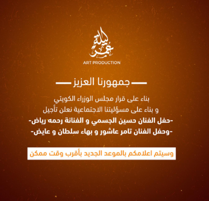 جاء بيان الشركة المنظمة كالتالي:" جمهورنا الكريم بناءً على قرار مجلس الوزراء الكويتي، وبناءً على مسؤوليتنا الاجتماعية، نُعلن عن تأجيل الفعالية الخاصة بـ حسين الجسمي، ورحمة رياض، وتامر عاشور، وبهاء سلطان، على أن يتم تحديد موعد الحفل الجديد خلال عدة أيام".