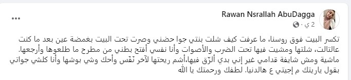 وجهت روان نصرالله فتاة فلسطينية رسالة مؤثرة من الوجع والألم الذى يتعرض له أهالى فلسطين ، وقالت بعد قصف منزلها وبعد أشهر قليلة من ولادتها لإبنتها إنها كانت أن تتمنى لو بإمكانها أن تعود بإبنتها إلى بطنها مرة أخرى لخوفها عليها.