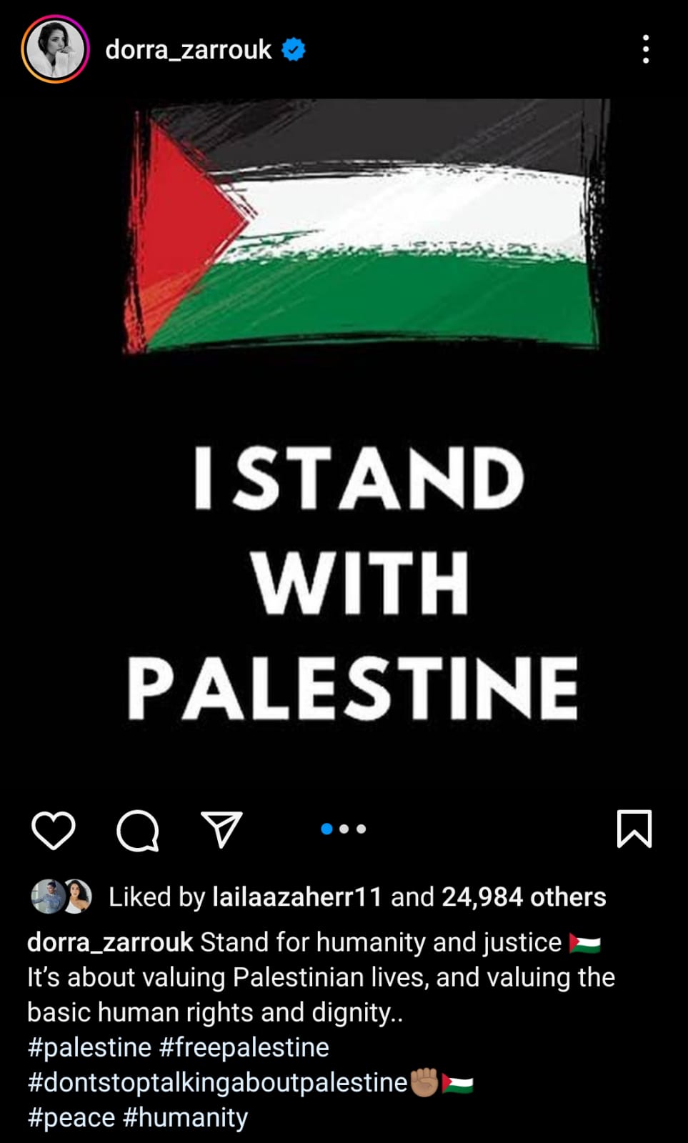نشرت الفنانة درة صورة على صفحتها الرسمية عبر موقع تبادل الصور و الفيديوهات “ انستجرام ” و علقت قائلة “ الوقوف من أجل الانسانية و العدالة، قد يتعلق الأمر بتقدير حياة الفلسطينيين، و تقدير حقوق الانسان الأساسية و كرامته ” .