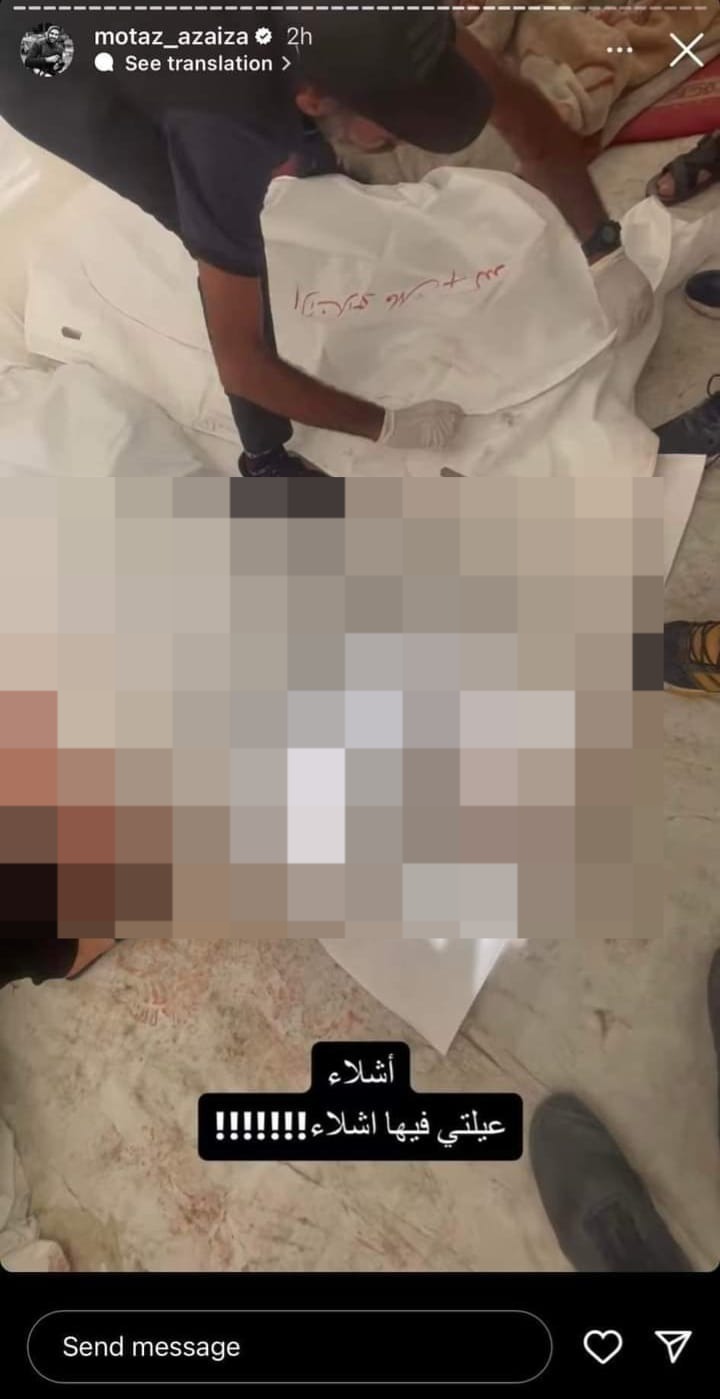 تصدر المصور الفلسطينى معتز عزايزة ، حديث مواقع التواصل الاجتماعى بعدما ذهب ليغطى قصف إسرائيل على أحد المناطق فى فلسطين ليجد أن الشهداء هم عائلته وتحولوا لأشلاء ليعلق قائلا" عيلتى يا الله".