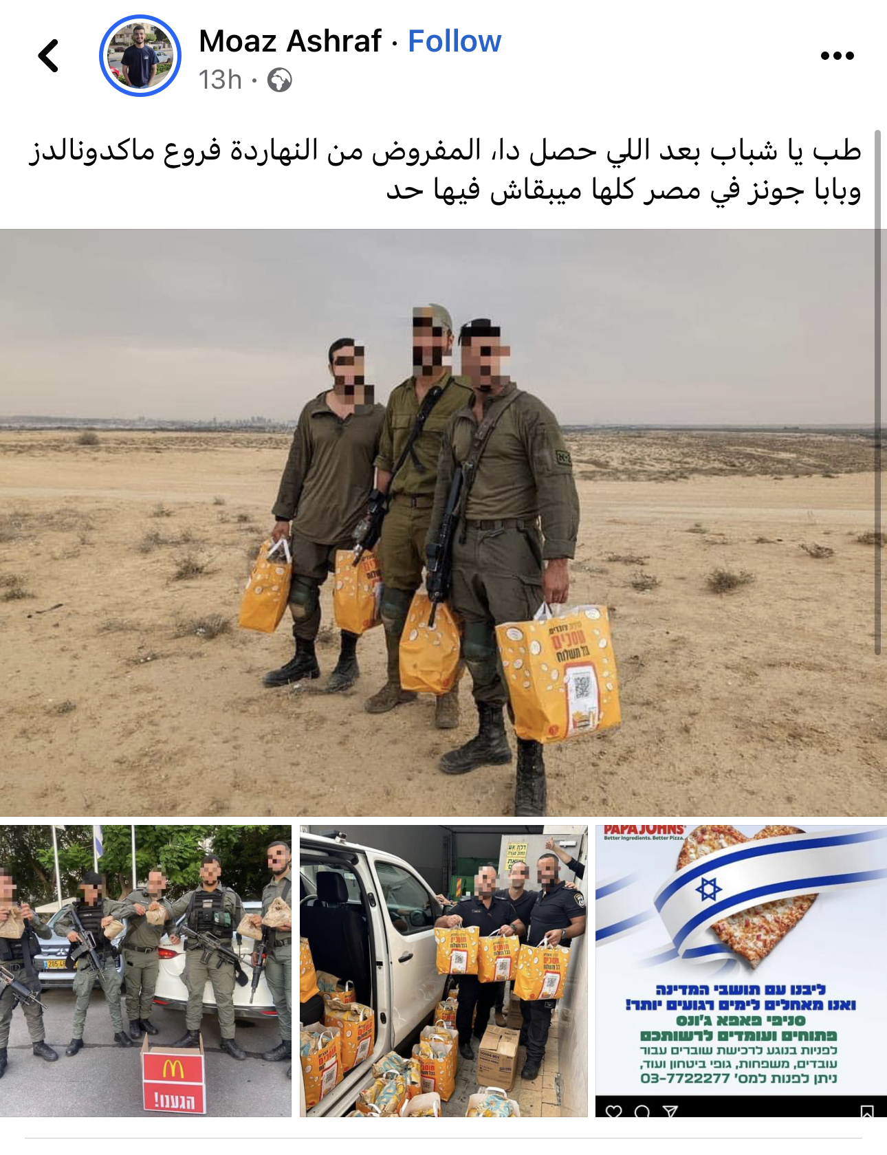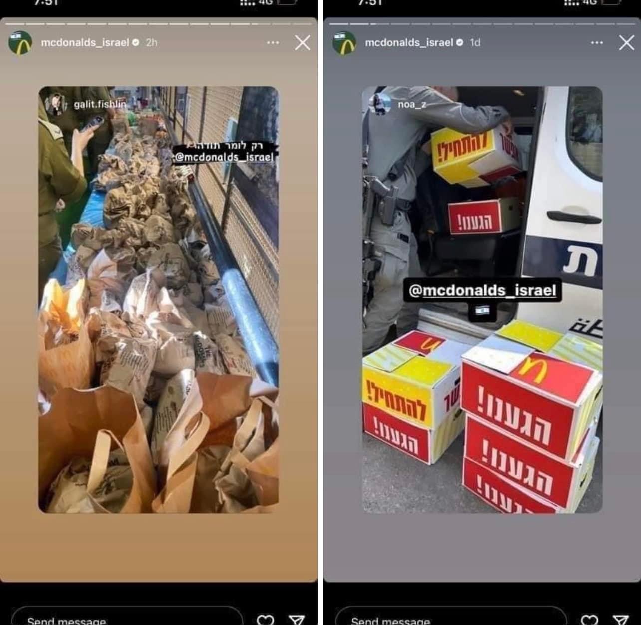 تصدرت صور لمطاعم الوجبات السريعة العالمية " ماكدونالدز" و" بابا جونز" السوشيال ميديا وسط دعوات لمقاطعة التعامل معهم بعد دعمهم لإسرائيل وتقديمهم وجبات مجانية لجيش الاحتلال.