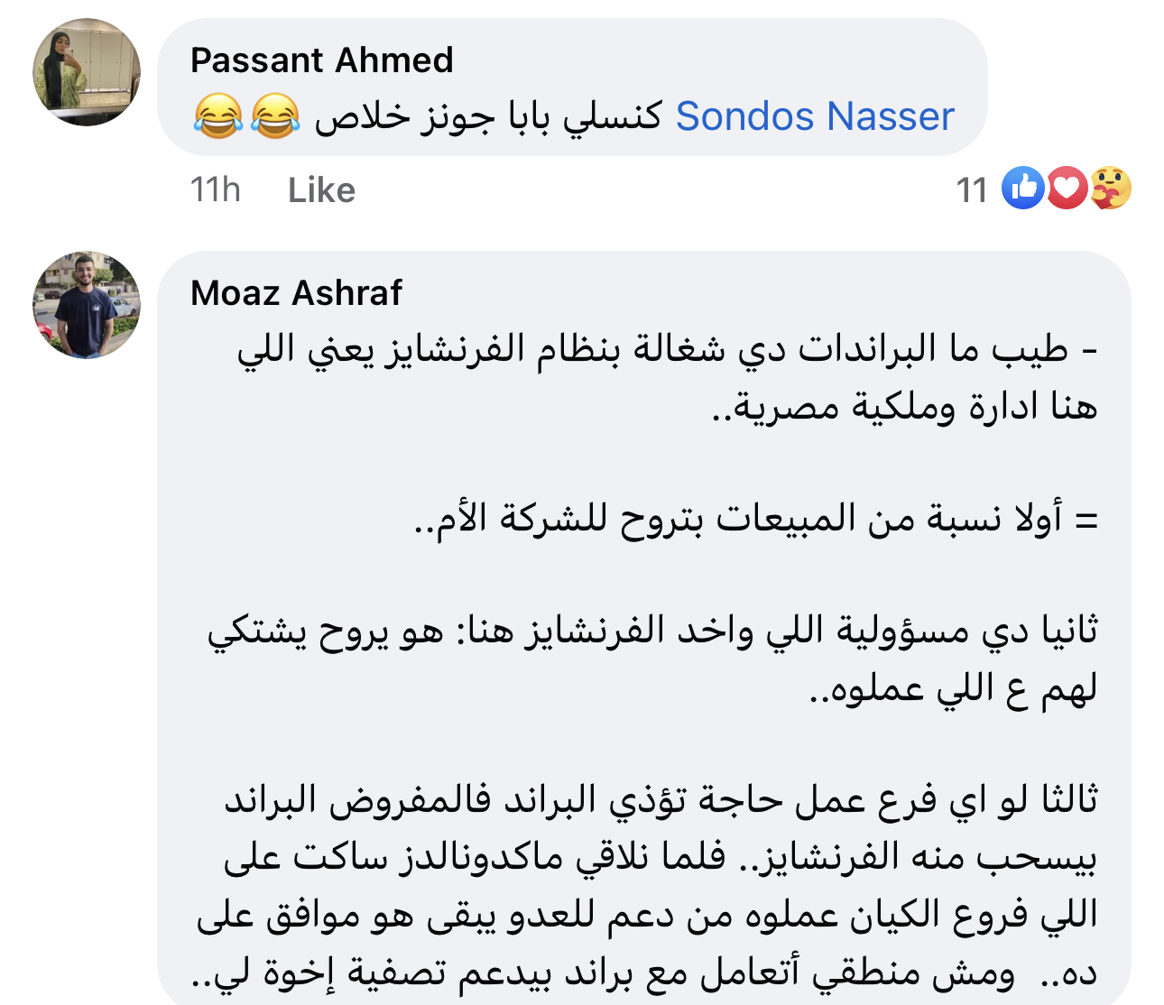 وقال أحد المواطنين ،"طب يا شباب بعد اللي حصل دا، المفروض من النهاردة فروع ماكدونالدز وبابا جونز في مصر كلها ميبقاش فيهاحد"، وعلق آخر،" - البراندات دي شغالة بنظام الفرنشايز يعني اللي هنا ادارة وملكية مصرية..أولا نسبة من المبيعات بتروح للشركة الأم.. ثانيا دي مسؤولية اللي واخد الفرنشايز هنا: هو يروح يشتكي لهم ع اللي عملوه.. ثالثا لو اي فرع عمل حاجة تؤذي البراند فالمفروض البراندبيسحب منه الفرنشايز.. فلما نلاقي ماكدونالدز ساكت على اللي فروع الكيان عملوه من دعم للعدو يبقى هو موافق على ده.. ومش منطقي أتعامل مع براند بيدعم تصفية إخوة لي".
