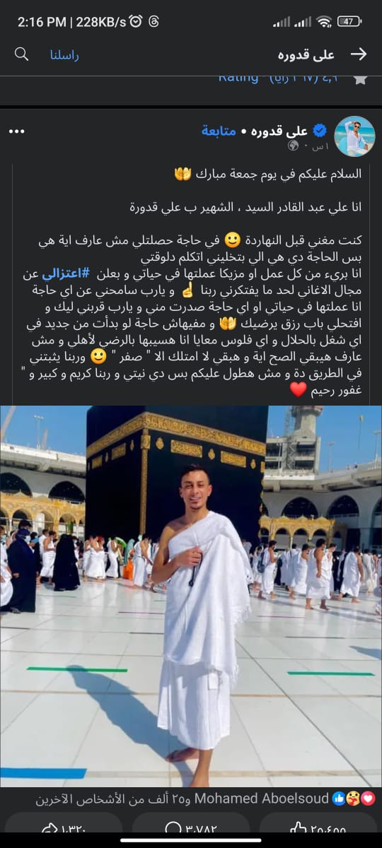 وتابع علي قدورة: "بعلن اعتزالي عن مجال الأغاني لحد ما يفتكرني ربنا ويارب سامحني عن أي حاجة انا عملتها في حياتي أو أي حاجة صدرت مني ويارب قربني ليك وافتحلي باب رزق يرضيك ومفيهاش حاجة لو بدأت من جديد في اي شغل بالحلال وأي فلوس معايا انا هسيبها بالرضى لأهلي ومش عارف هيبقى الصح ايه وهبقى لا امتلك إلا "صفر" وربنا يثبتني في الطريق ده ومش هطول عليكم بس دي نيتي وربنا كريم وكبير و“غفور رحيم”