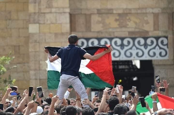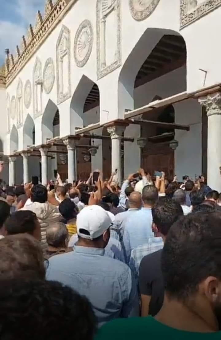 وخرج المصلون إلى صحن الجامع الأزهر، وأمام المسجد في الساحة الخارجية، رجالا ونساء، يرددون الهتافات ويرفعون علم فلسطين، دعما منه للوقفة الفلسطينية ضد هذا الاحتلال.