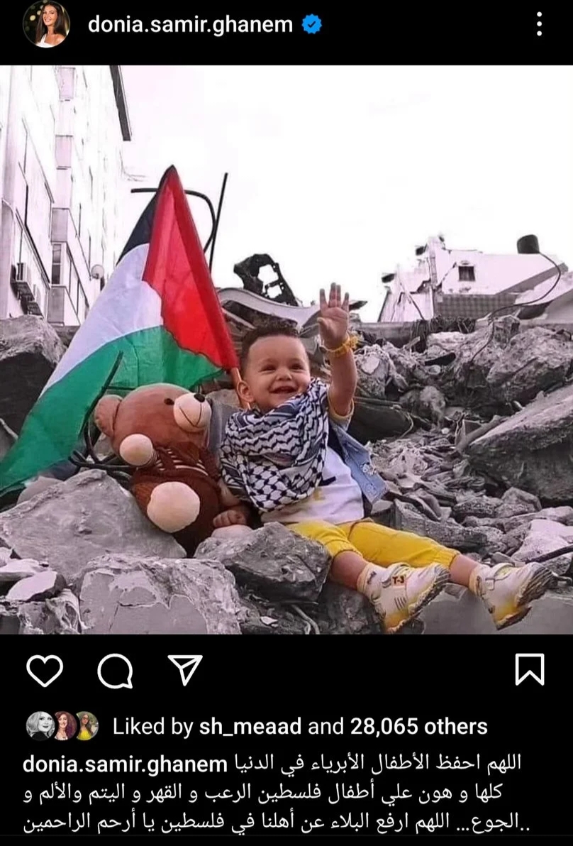 دعمت الفنانة دنيا سمير غانم القضية الفلسطينية وشعبها عبر صفحتها على موقع التواصل الاجتماعي لتبادل الصور والفيديوهات القصيرة إنستجرام.