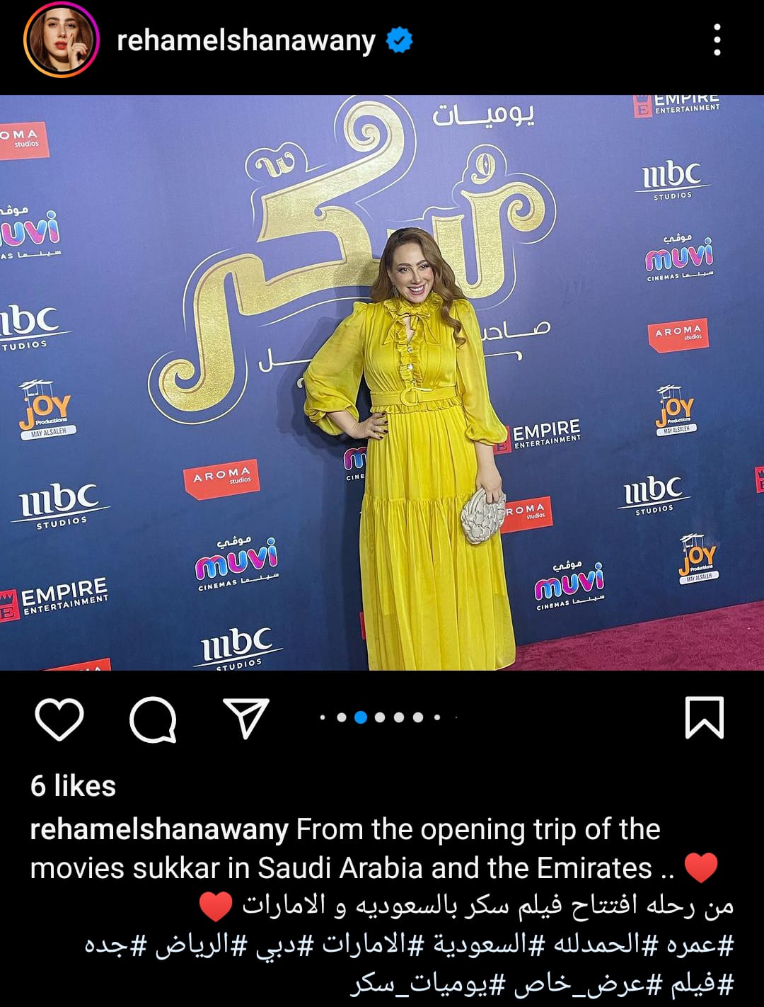نشرت الفنانة ريهام الشنواني صور على صفحتها الرسمية عبر موقع تبادل الصور و الفيديوهات “ انستجرام ” و علقت قائلة “ من رحلة افتتاح فيلم سكر بالسعودية و الامارات ” .