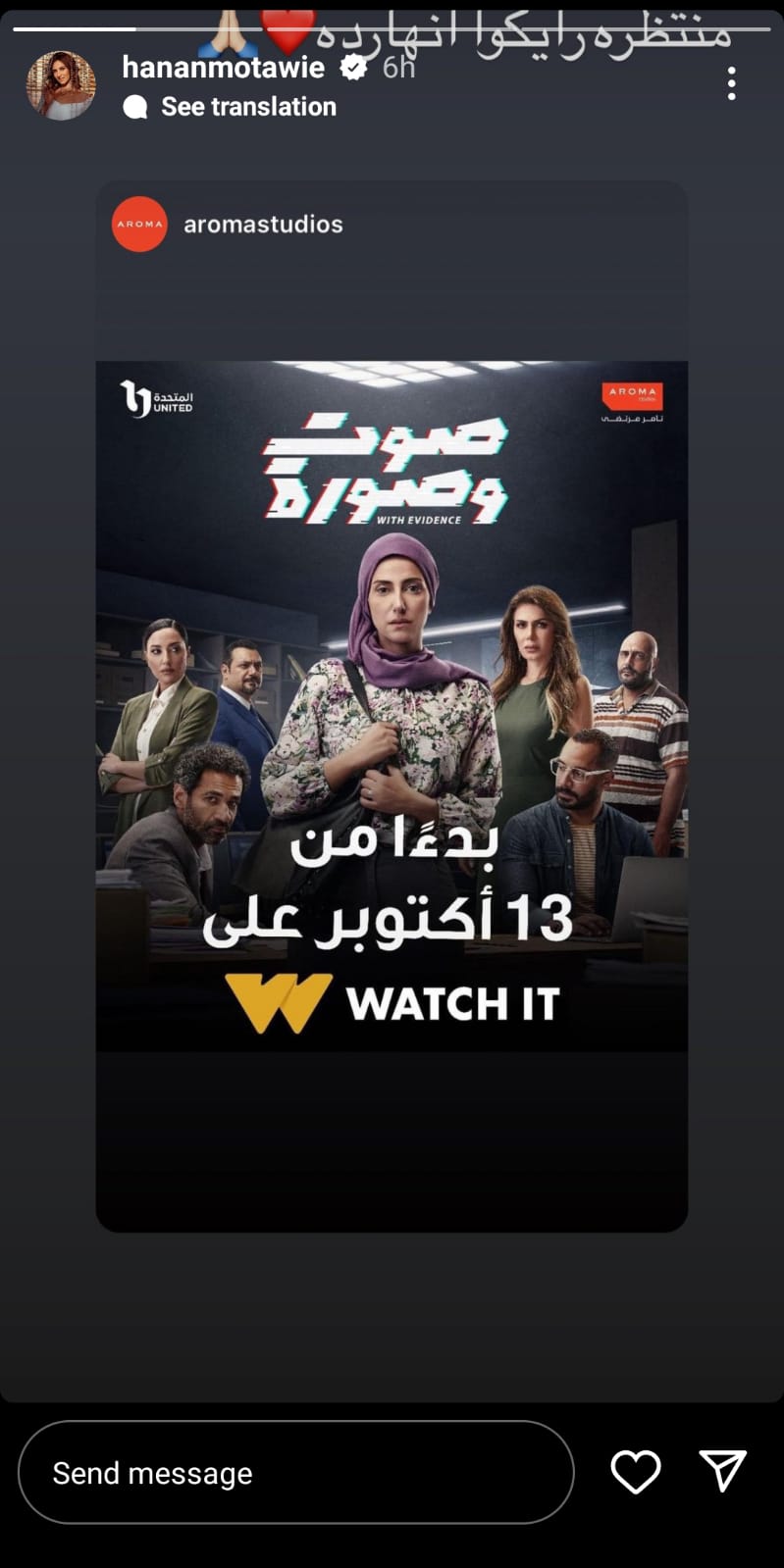 نشرت حنان مطاوع ستوري على صفحتها الرسمية عبر موقع تبادل الصور و الفيديوهات “ إنستجرام ” و علقت قائلة “ بدءا من 13 أكتوبر على Watch It ” .