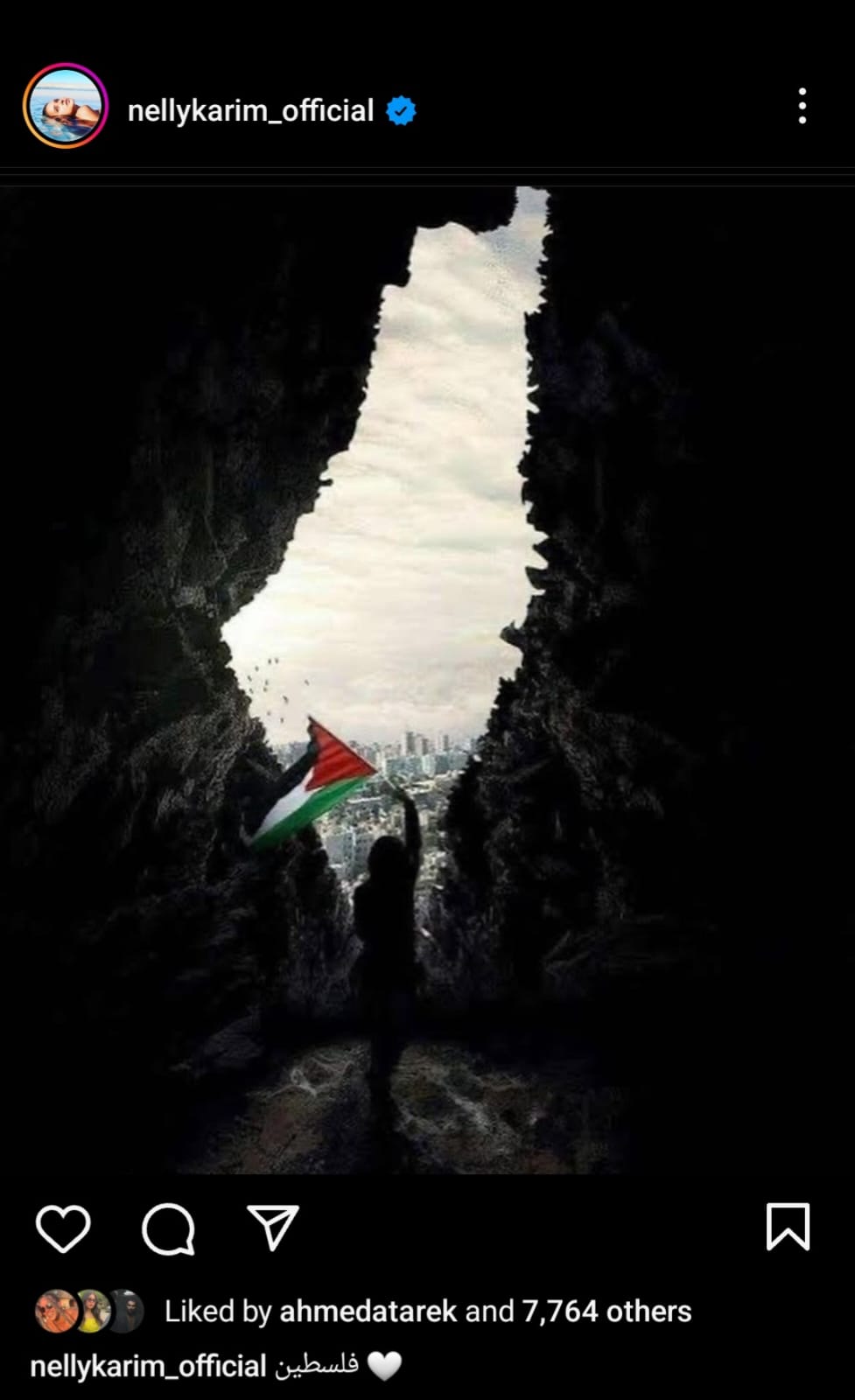 أعلنت الفنانة نيللي كريم تضامنها مع الشعب الفلسطيني،وذلك عبر حسابها الخاص بموقع تبادل الصور والفيديوهات"انستجرام"، وعلقت نيللي قائلة"فلسطين".