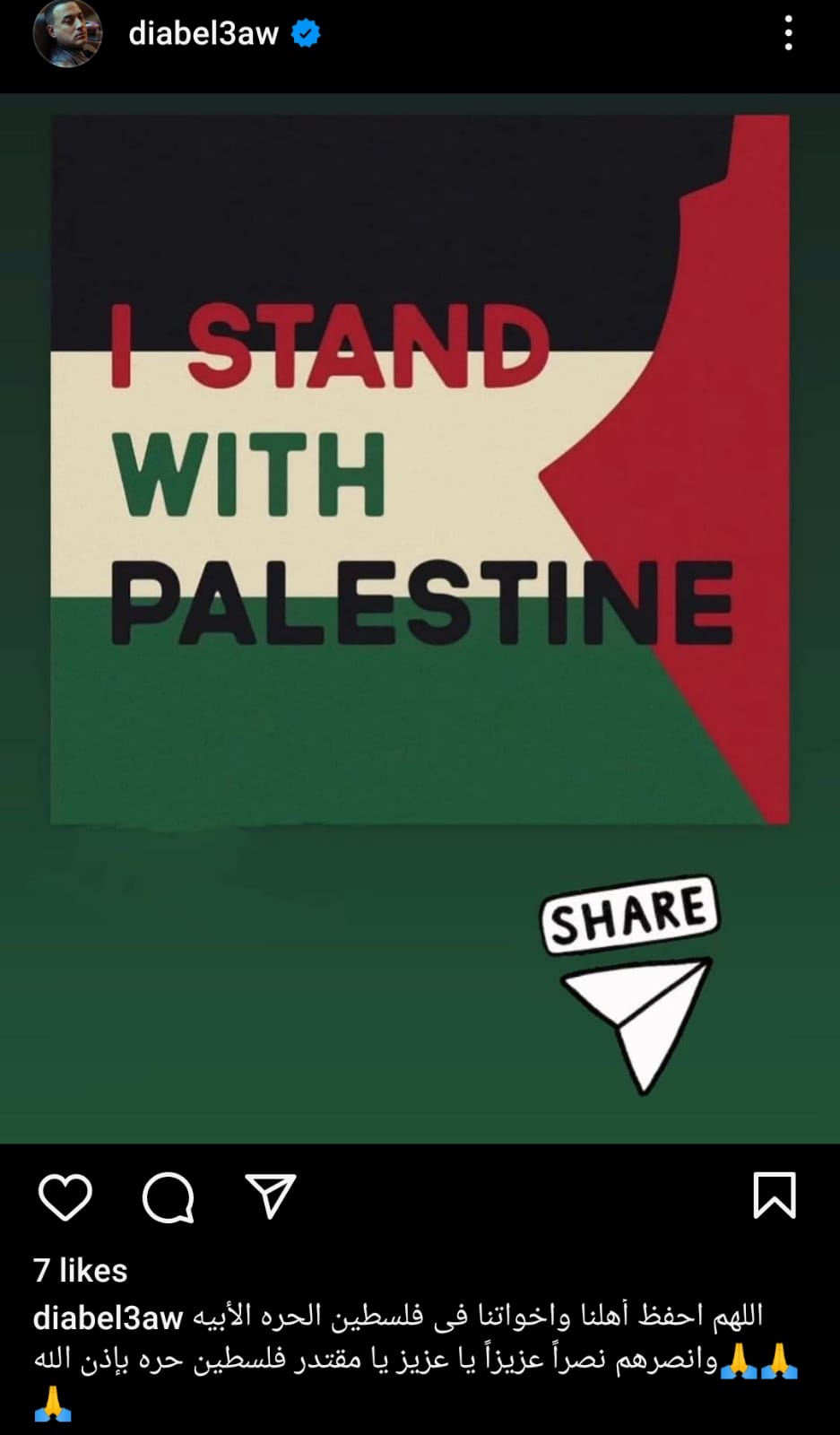 كما نشر دياب صورة على صفحته الرسمية عبر موقع تبادل الصور و الفيديوهات “ إنستجرام ” و علق قائلا “ اللهم احفظ أهلنا و إخواتنا في فلسطين الحرة الأبية، و انصرهم نصرا عزيزا يا عزيز يا مقتدر .. فلسطين حرة بإذن الله ” .