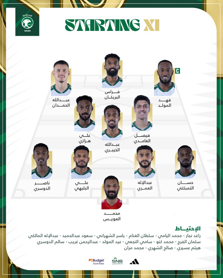 خط الدفاع: ياسر الشهراني، علي البليهي، عبد الإله العمري، حسان تمبكتي، أحمد شراحيلي، سلطان الغنام، سعود عبد الحميد، أحمد بامسعود، رياض شراحيلي.