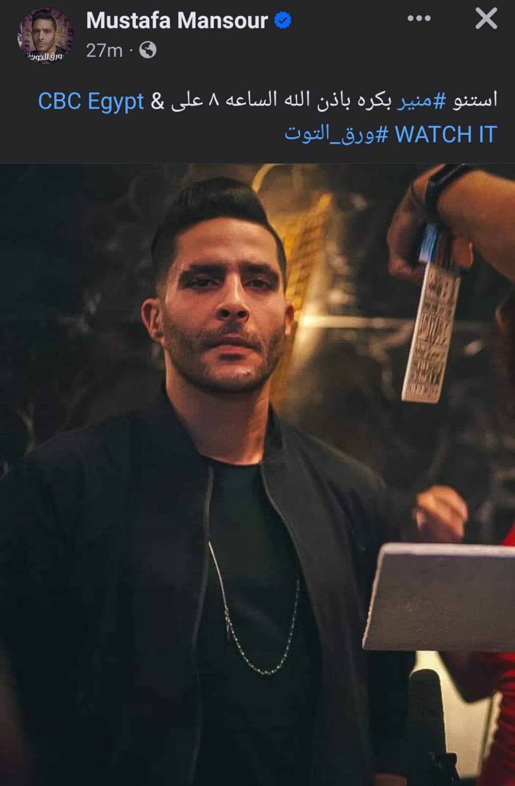 روج الفنان مصطفى منصور لمسلسله الجديد “ ورق التوت ” الذي من المفترض أن تبدأ أولى حلقاته غدا السبت 14 أكتوبر، و ذلك من خلال صورة نشرها على صفحته الرسمية عبر موقع التواصل الاجتماعي “ فيسبوك ”، حيث علق قائلا “ استنوا منير بكرة بإذن الله الساعة 8 على CBC و Watch It ” .