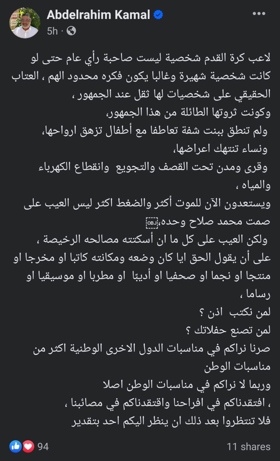 كتب عبد الرحيم كمال منشور على صفحته الرسمية عبر موقع التواصل الاجتماعي “ فيسبوك ” و علق قائلا “ لاعب كرة القدم شخصية ليست صاحبة رأي عام حتى لو كانت شخصية شهيرة، و غالبا يكون فكره محدود، و العتاب الحقيقي على شخصيات لها ثقل عند الجمهور، و كونت ثروتها الطائلة من هذا الجمهور” .