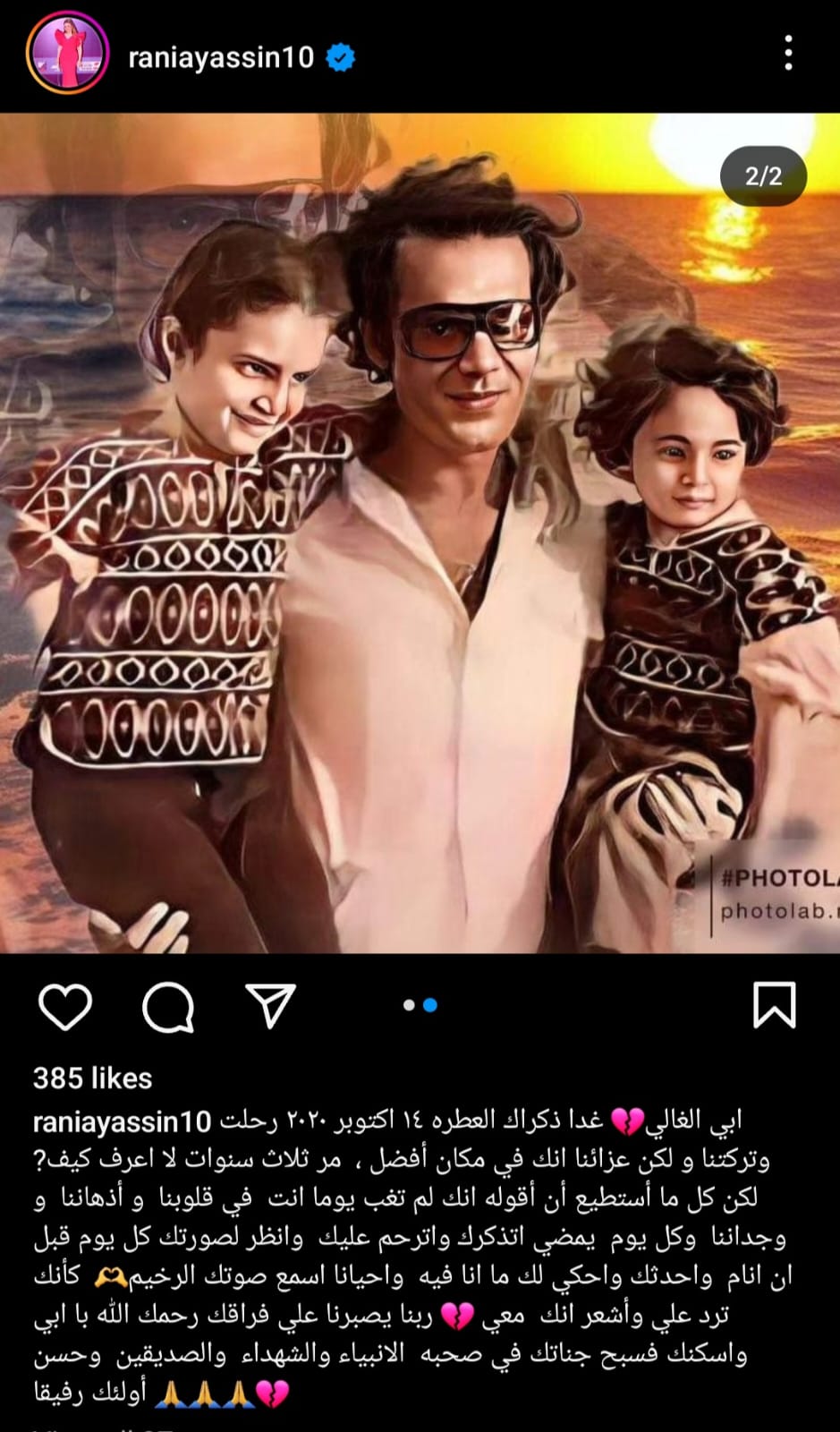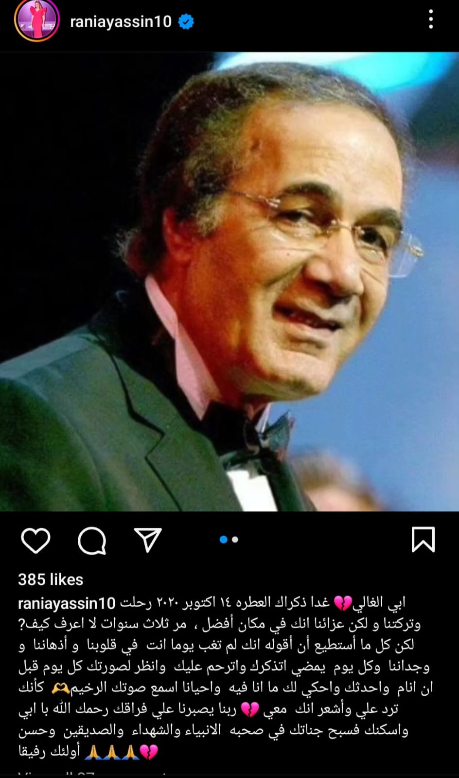 علقت رانيا قائلة"أبي الغالي غدا ذكراك العطرة 14 أكتوبر 2020 رحلت وتركتنا،ولكن عزائنا إنك في مكان أفضل،مر ثلاث سنوات لا أعرف كيف،لكن كل ما استطيع أن أقوله إنك لم تغب يوما أنت في قلوبنا وأذهاننا و وجداننا وكل يوم يمضي اتذكرك و اترحم عليك وانظر إلى صورتك قبل أن أنام واحدثك واحكي لك ما أنا فيه وأحيانا اسم صوتك الرخيم كأنك ترد علي وتشعر أنك معي ربنا يصبرنا على فراقك رحمك الله يا أبي واسكنك فسيح جناته في صحبة الأنبياء والشهداء والصديقين وحسن أولئك رفيقا.
